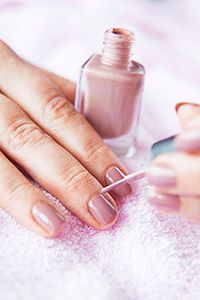 | 4. Lakkaa kynnet. Pyyhi kynnet kynsilakan poistoaineella, jossa ei ole kuivattavaa asetonia. Levitä kynsille ensin aluslakkaa, sillä se tasoittaa ja suojaa kynttä. Värilakkaa levitetään kaksi ohutta kerrosta. Anna kerrosten kuivua välillä. Sivele kynnelle lopuksi päällyslakka, joka pidentää lakkauksen kestoa. |