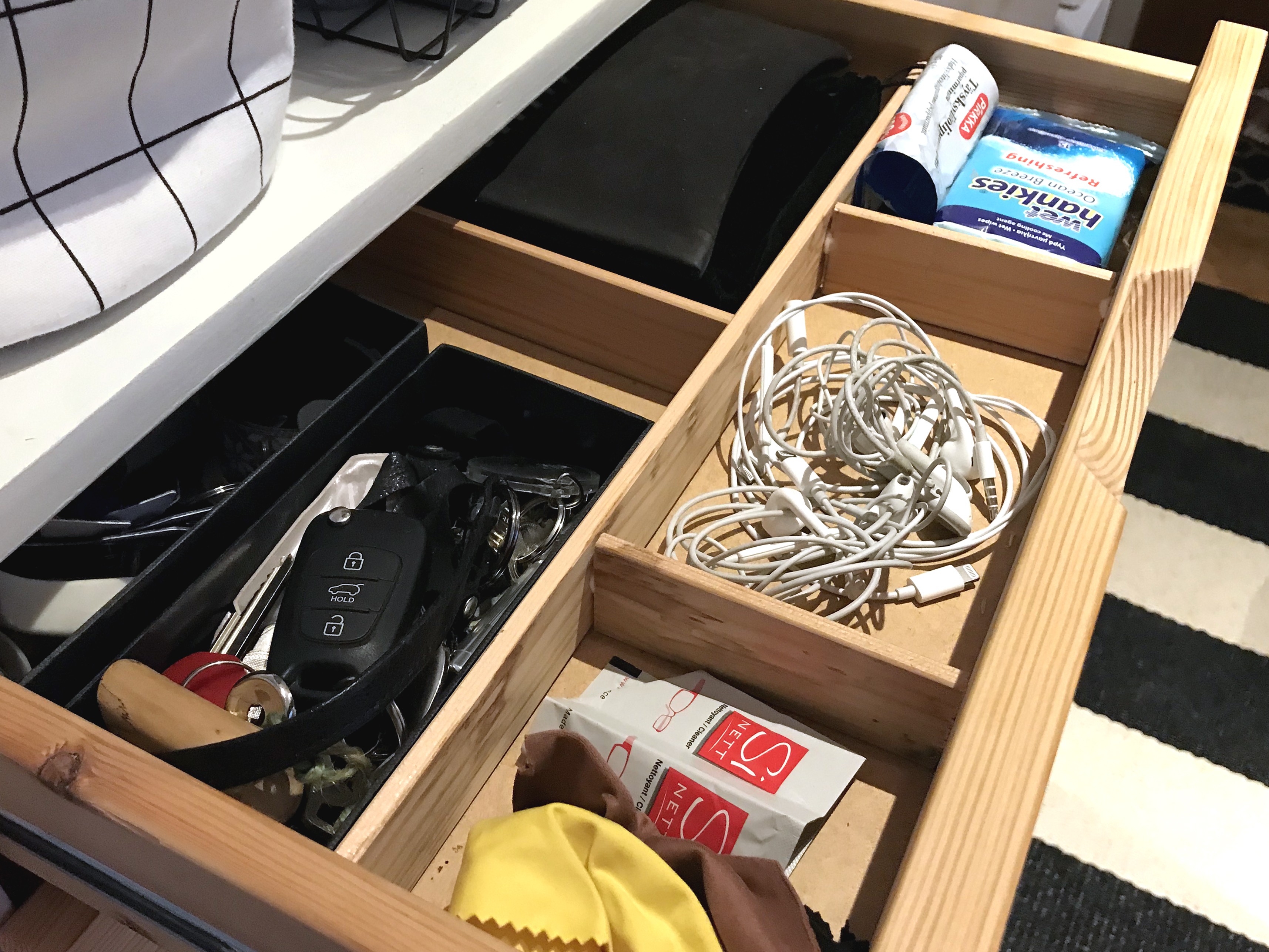 Kuulokkeet, silmäläsinpuhdistusvälineet, avaimet ja muu pikkusälä pysyvät siivosti omissa lokeroissaan. Jos et ole askartelijatyyppiä, muun muassa Ikealta löytyy edullisesti myös valmiita jakajia.