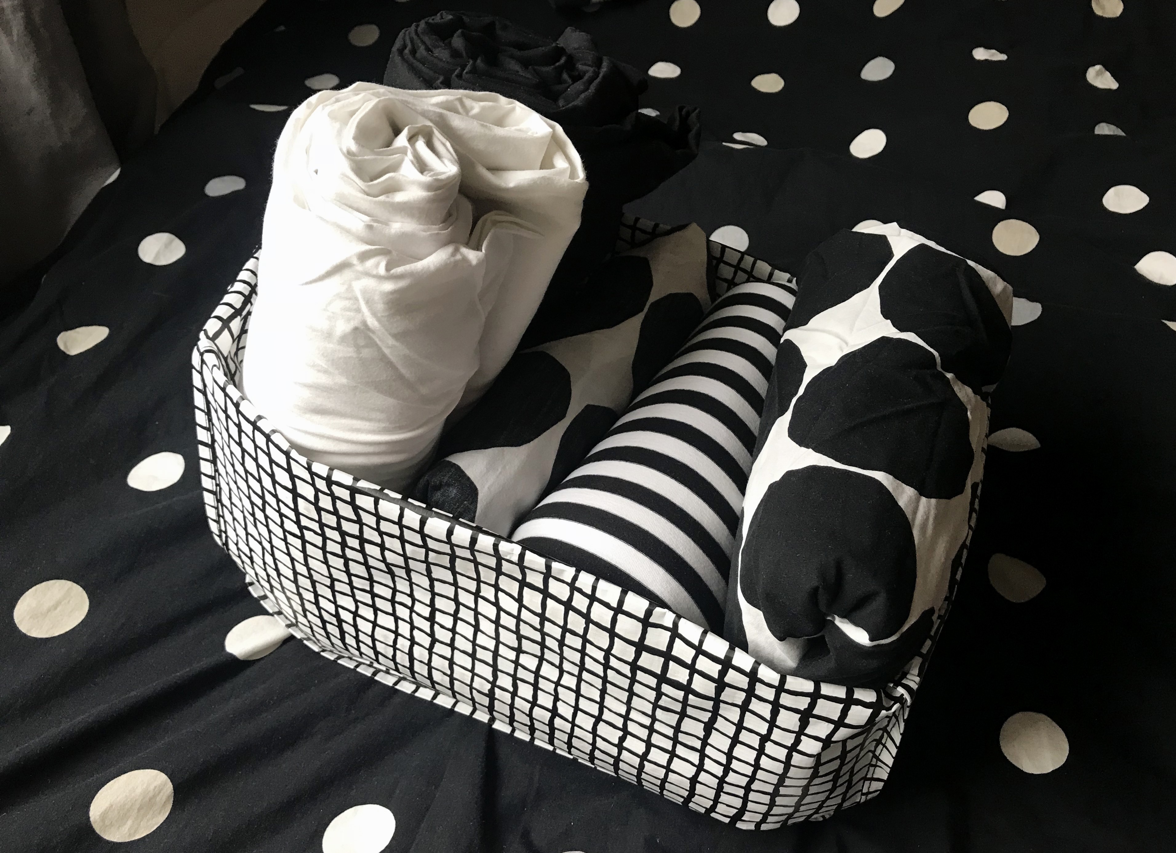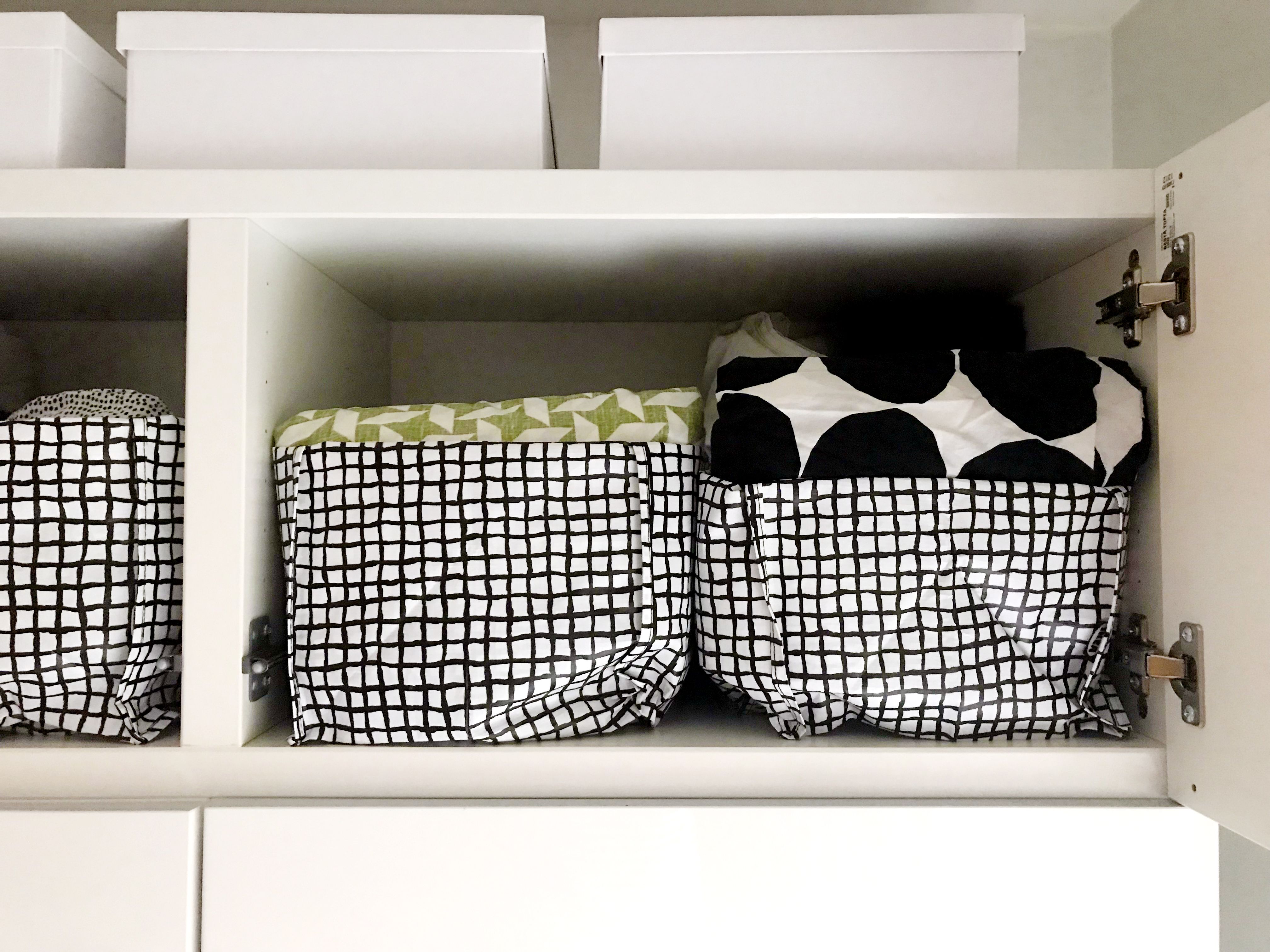 Kestokassiin pakatut lakanapinot on helppo vetää kaapista esille, ja valikoiman näkee yhdellä silmäyksellä konmari-henkisen pystyviikkauksen ansiosta. Ikean mustavalkoisista kestokasseista leikkasin noin 10 senttiä yläosasta pois (vetoketju ja kantokahvat) ja taittelin reunat sisäänpäin, jolloin laatikosta tulee sopivan jämäkkä. Kestokassit myös muotoutuvat pehmeästi toistensa lomaan eivätkä kolise kuten muoviset laatikot. Ruudullisia kasseja myy Ikea. Niillä saa kivan hillityn kestokassilaatikkosetin, mutta kasseista pitää vain ensin leikata pois vetoketju ja hihnat.
