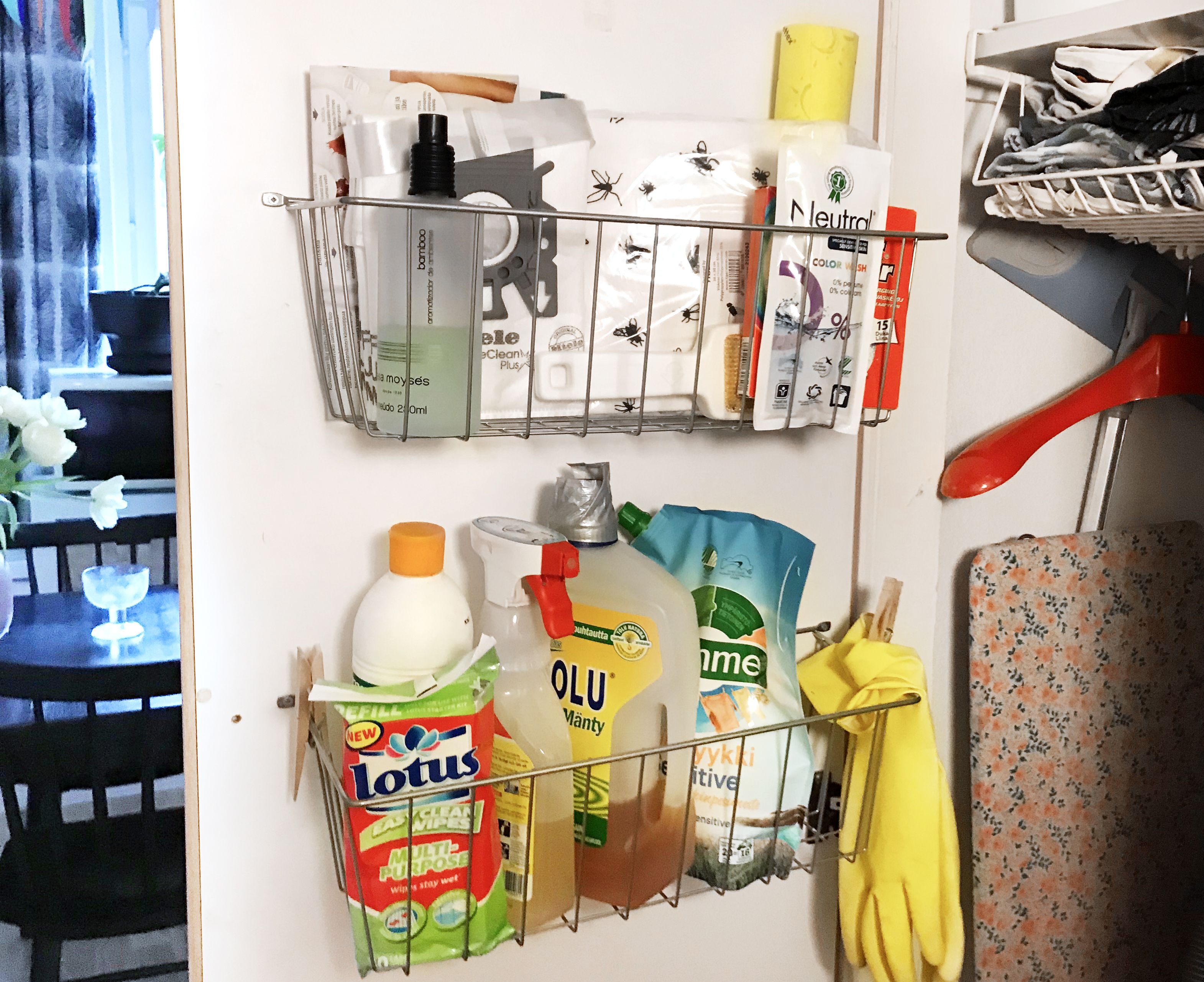 Siivouskaapin oveen voi ruuvata kapeat korilaatikot, joihin saa näppärästi eniten käytetyt pesuaineet ja rätit. Jos et raaski porata oveen reikää, korit voi kiinnittää myös pienillä tarrakoukuilla.