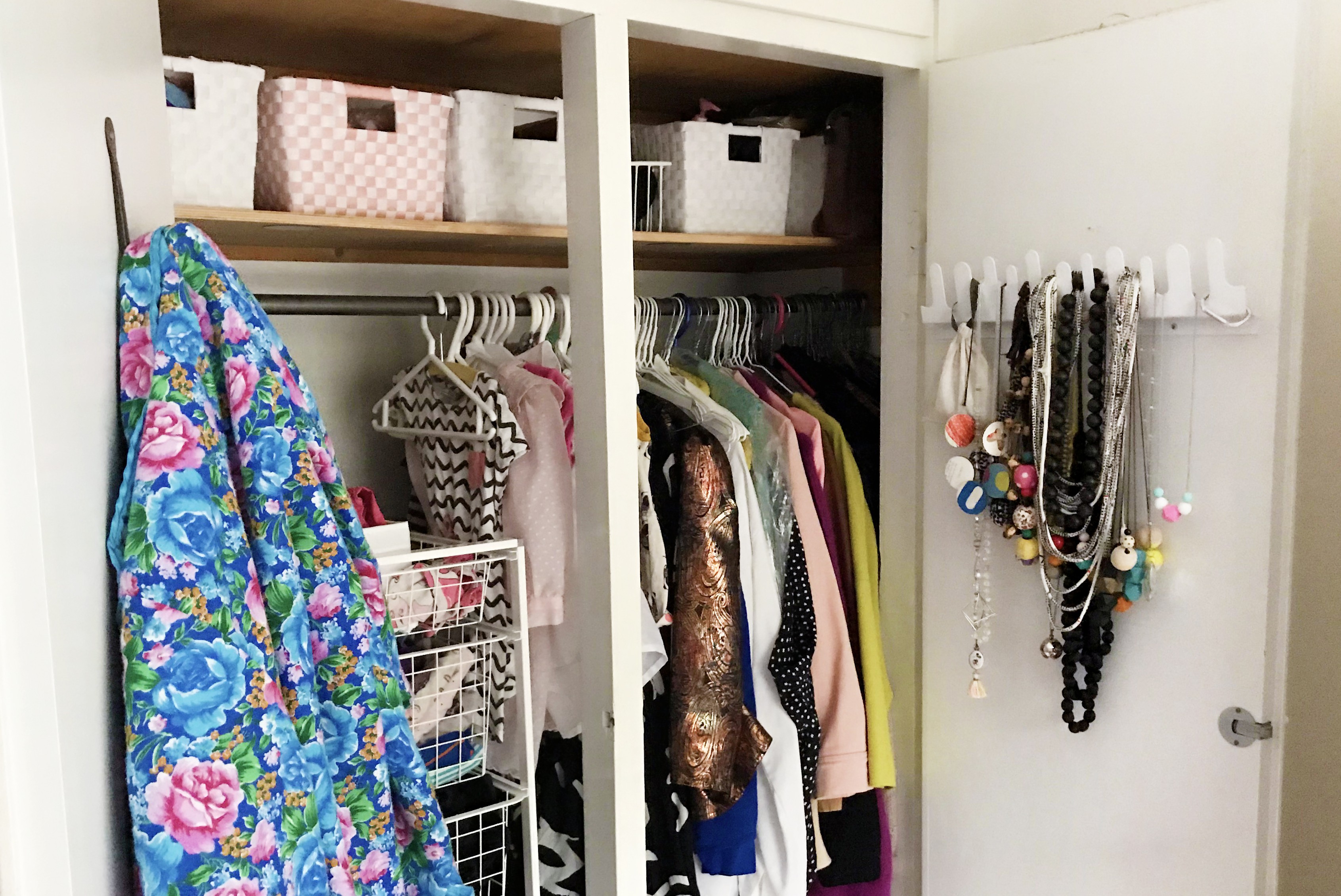 Vanha vaatekaappi vetää paljon tavaraa sisäänsä. Vieläkin enemmän sinne mahtuu, kun ottaa myös ovet käyttöön. Toiseen oveen ruuvasin vaatekoukun kylpytakeille, toisessa on kiinni koruteline, jossa helyt säilyvät siististi.