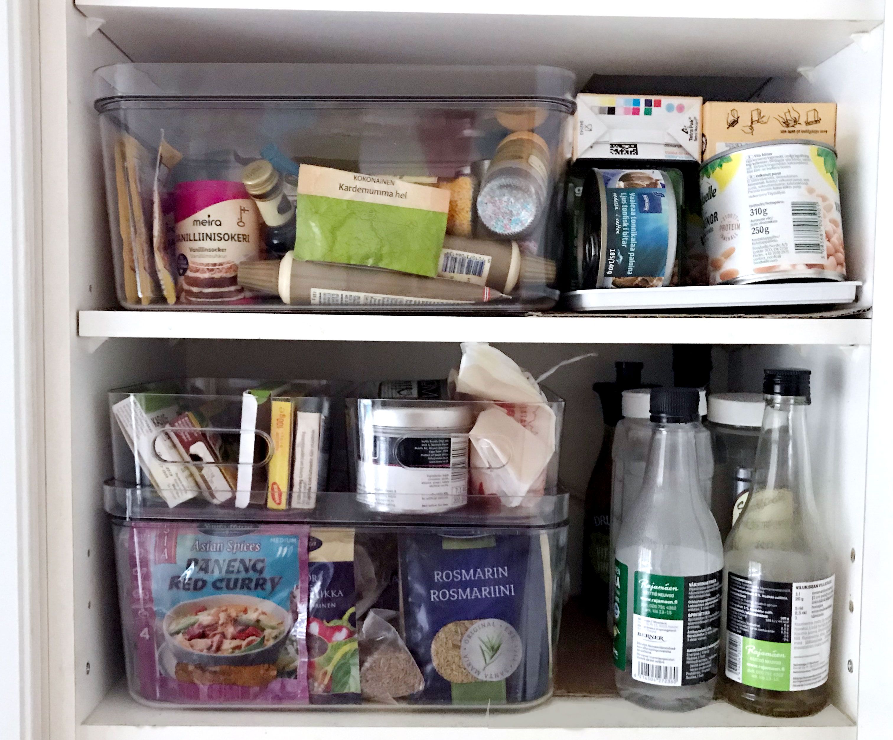 Maustekaappi on ollut haastava, sillä kokkaan paljon ja erilaiset pussukat ovat seilanneet milloin missäkin laatikossa. Vasta läpinäkyvillä, kirkasmuovisilla laatikoilla kaappiin palautui järjestys. Laatikosta näkee heti, mitä siellä on, ja ne myös pinoutuvat näppärästi päällekkäin.