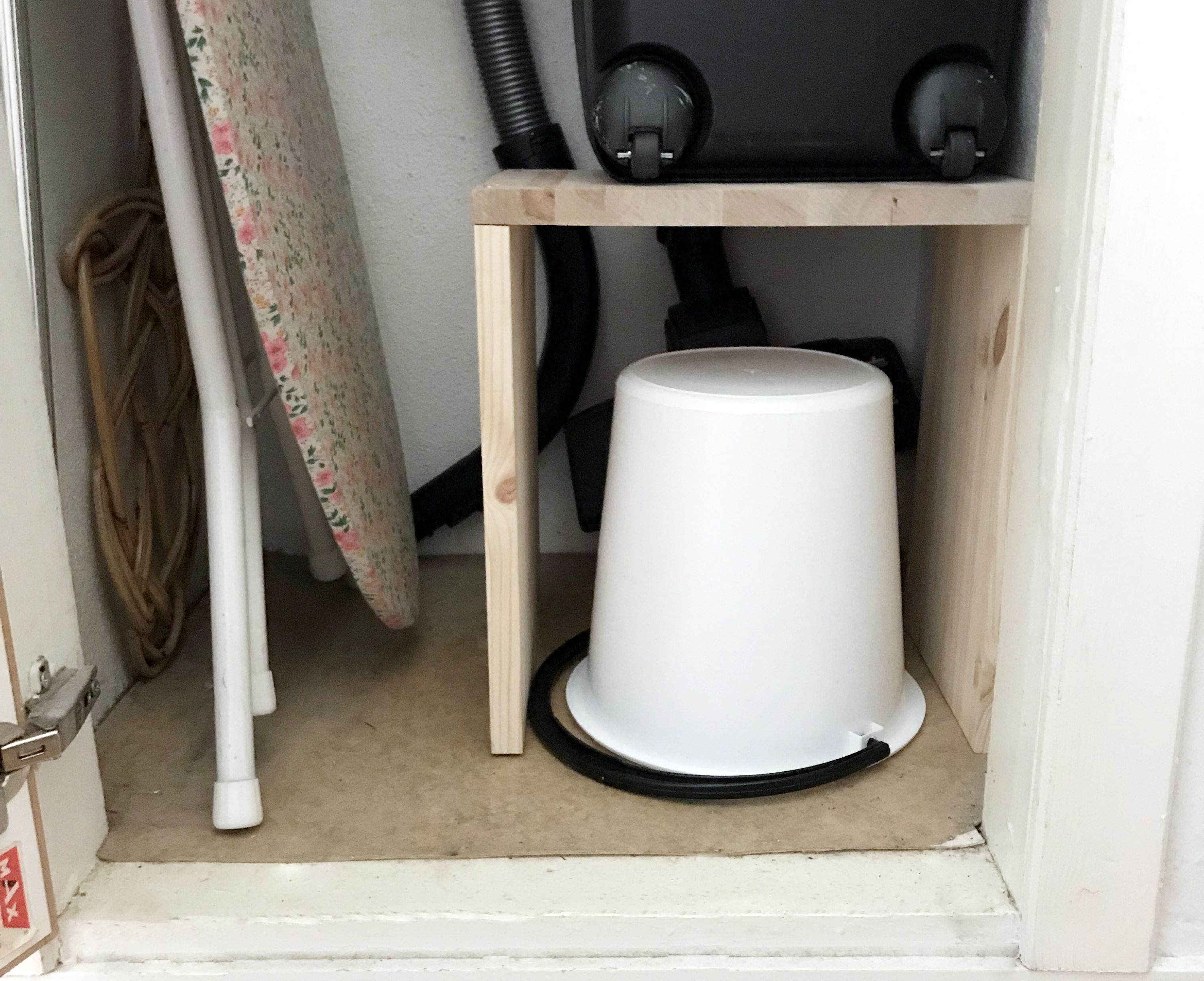 Itse olen erityisen innostunut siivouskomeroon nikkaroimastani hyllytasosta, jonka päälle saa imurin sievästi nököttämään ja alle mahtuvat siivoussangot. Katso täältä ohjeet tason tekemiseen! Kokoa voit varioida oman tarpeesi mukaan.