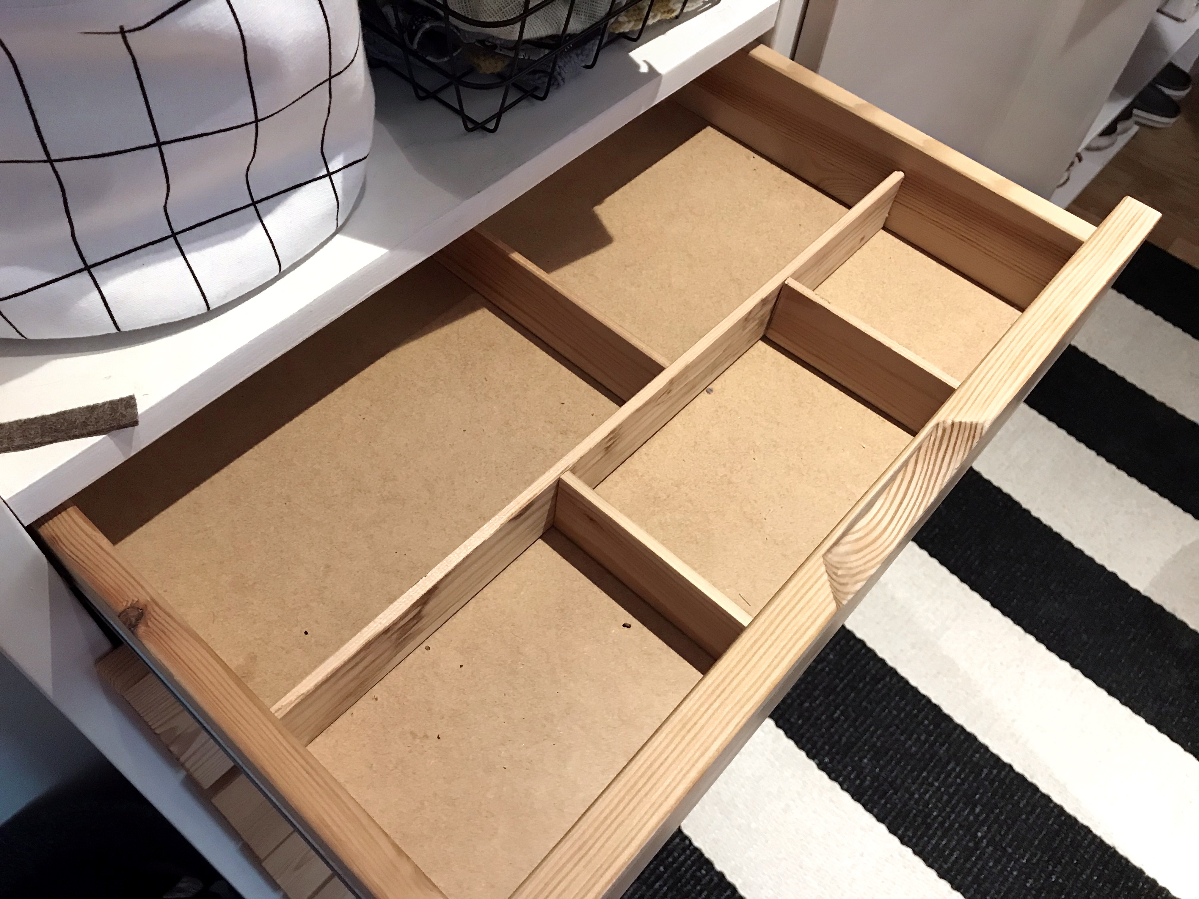 Yleensä tavarat tuppaavat ajelehtimaan laatikoissa ikävästi pitkin poikin ja sikin sokin. Kannattaa ottaa talteen kaikki mahdolliset pienet ja matalat, lujatekoisemmat pakkaukset ja hyödyntää ne pikkutavaraa ja sälää sisältävissä vetolaatikoissa.