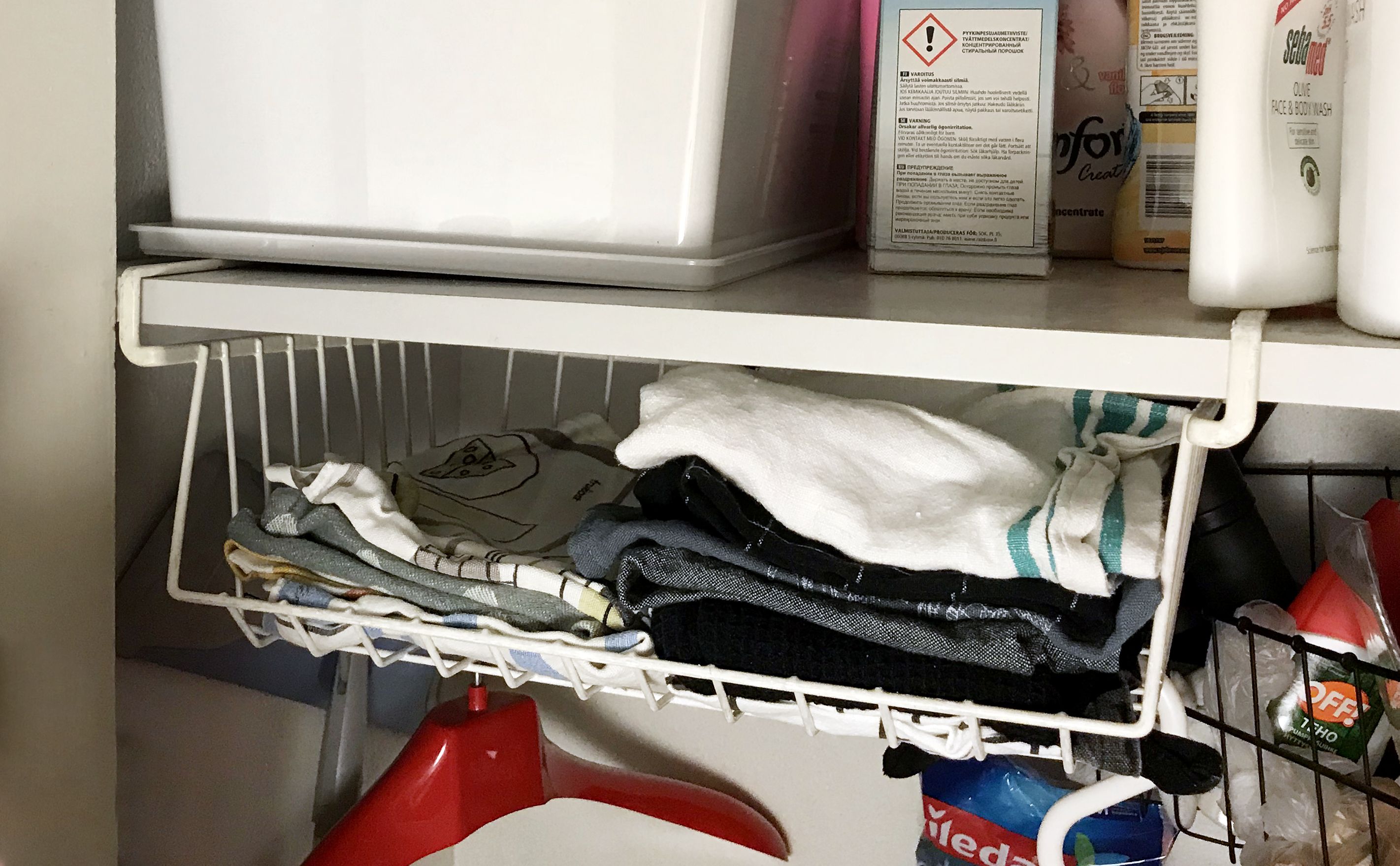 Katsele kaappeja hyllyn alustoja silmällä pitäen. Jos löydät hukkatilaa, sen voisi hyödyntää vaikkapa roikkuvalla korihyllyllä, jossa vaikkapa siivousliinat säilyvät näppärästi pinoissa.