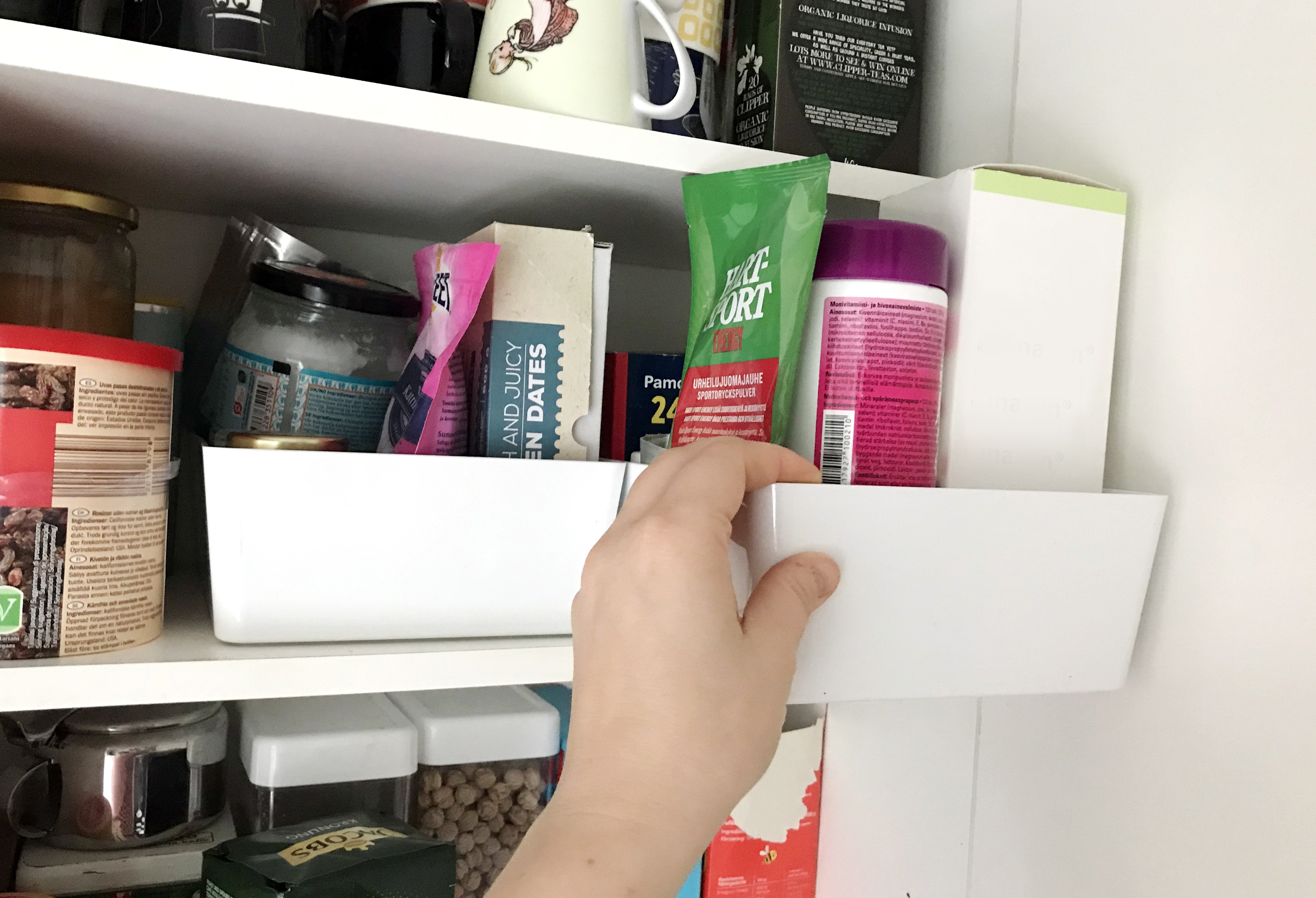 Yleensä aina juuri se asia, mitä etsii, on kaapissa takimmaisena ja siihen käsiksi päästäkseen on siirreltävä monta tavaraa edestä pois. Sain ison ahaa-elämyksen, kun näin vinkin vetolaatikoiden tekemisestä kaappeihin, joissa niitä ei ole. Suuria asennustöitä tai investointeja ei tarvita – kestokassit ja hyvät säilytyslaatikot riittävät.