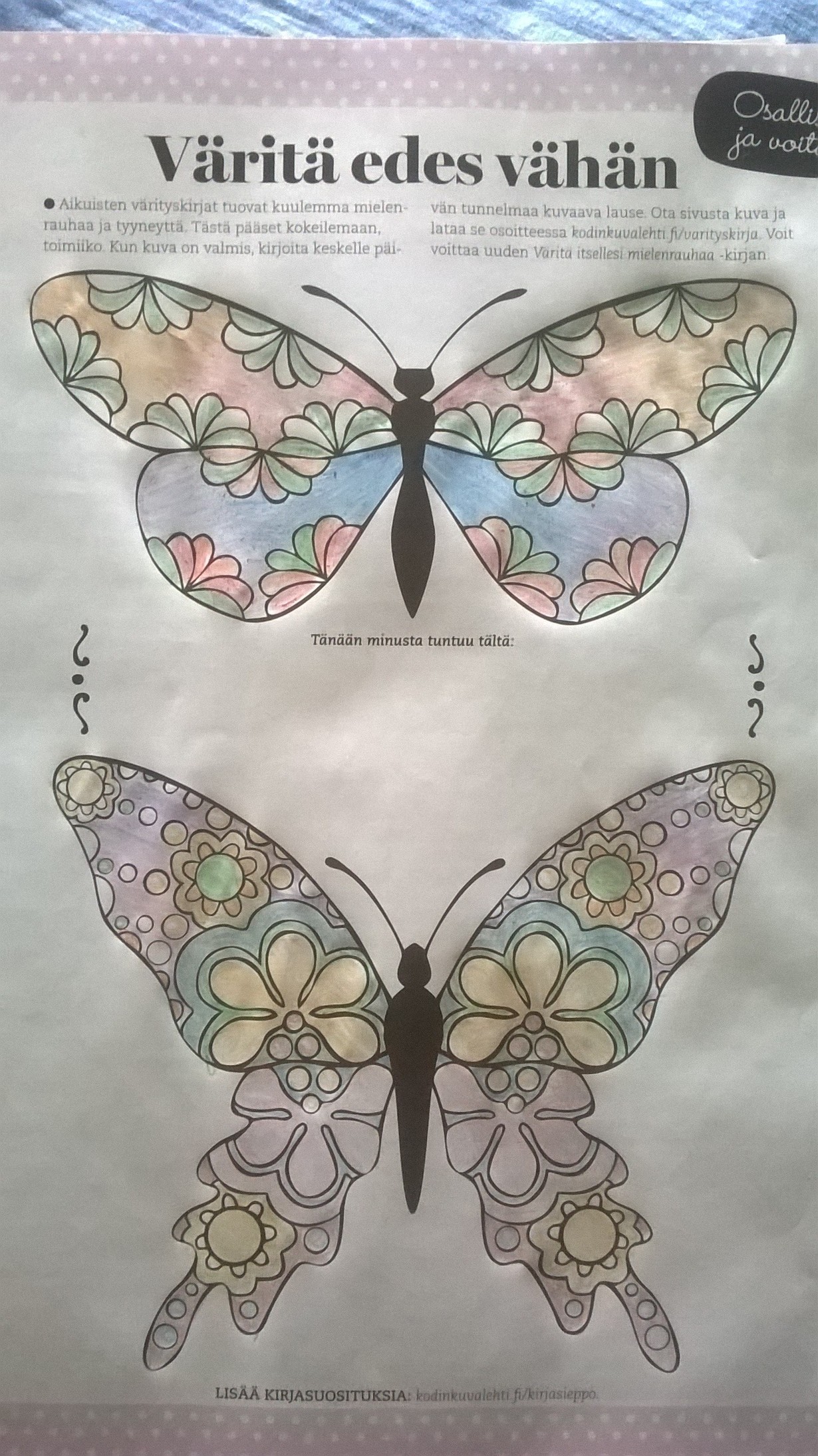 Mielenrauhaa aikuisten värityskirjasta - väritä perhoset ja voita!