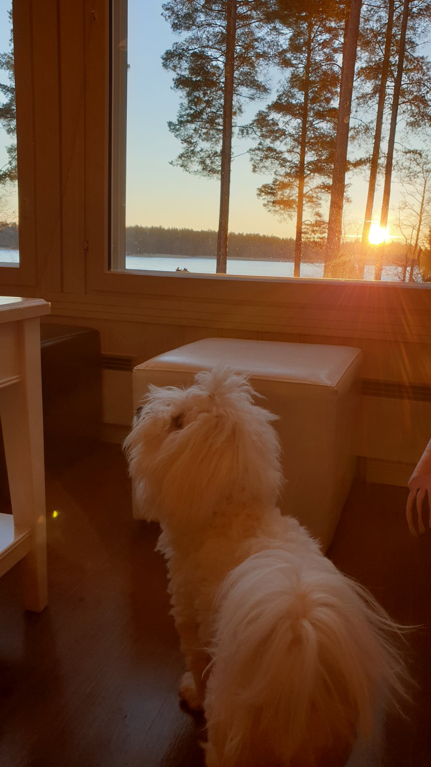Lempi 9,5kk (coton de tulear) katselee merelle aamuauringossa Askaisissa.
