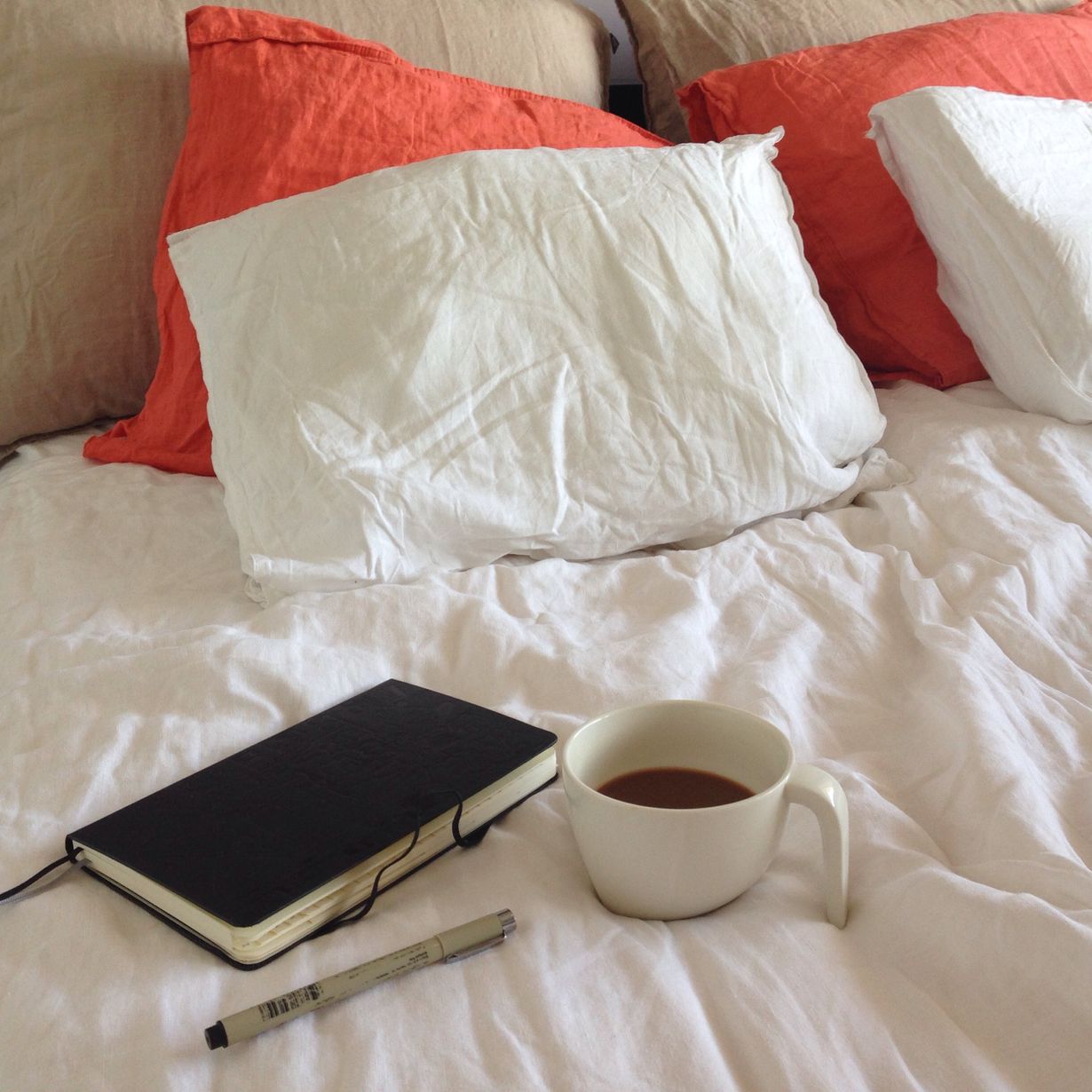 Vapaapäivän aamukahvi lempimukista, muistikirja ja viileän pehmoiset pellavalakanat.