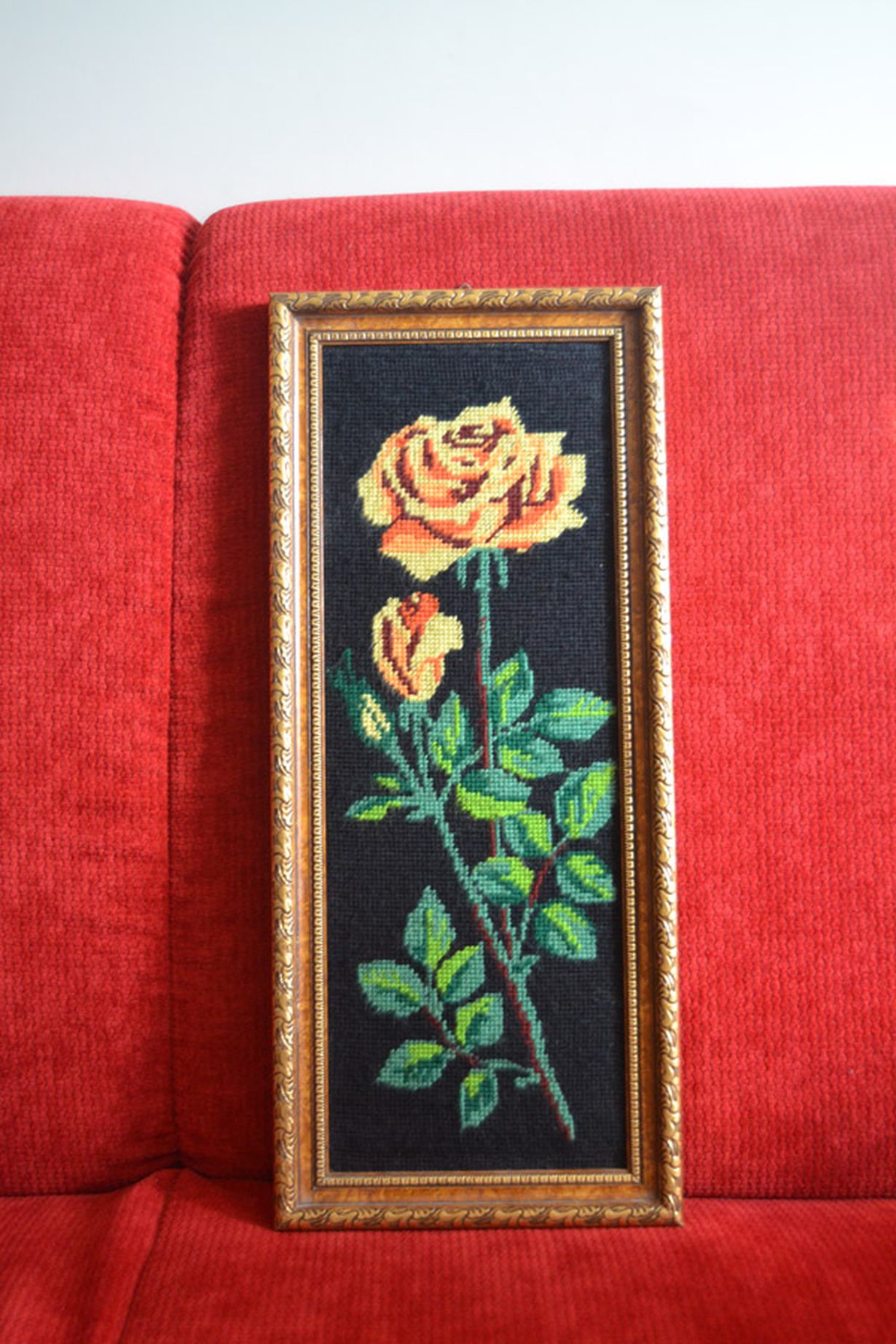 Äitini kirjontatyö vuodelta 1965, jonka hän lapsuudenkodissaan sai juuri valmiiksi ennen samana vuonna pidettäviä 300 vieraan hääjuhliaan.