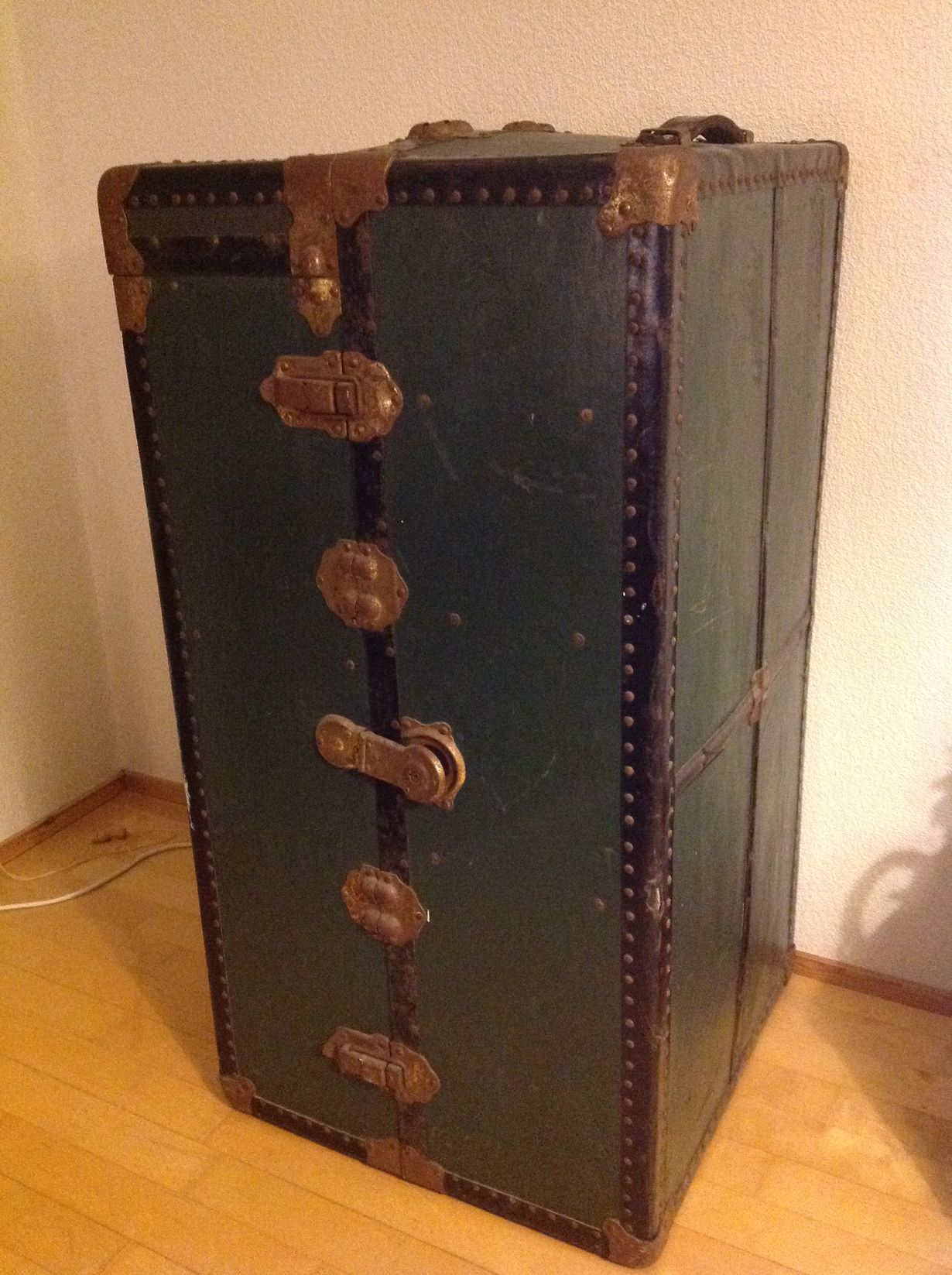 Löysimme huippukuntoisen Amerikan-arkun sattumalta pienen paikkakunnan osto- ja myyntiliikkeestä. Arkku on viehättävän alkuperäinen! Hattukuvut ja henkarit ovat tallella. Sen päällä on "tarra", jonka mukaan arkku on seilannut Atlantin yli Leviathan-nimisellä laivalla. Alus oli Titanicin sisaralus! Nahkaiseen kantokahvaan on stanssattu arkun silloinen paino. Meillä arkussa säilytetään valokuva-albumeita. Arkun lukkoa on syytä varoa! Jos sen loksauttaa kiinni, avainta ei ole.