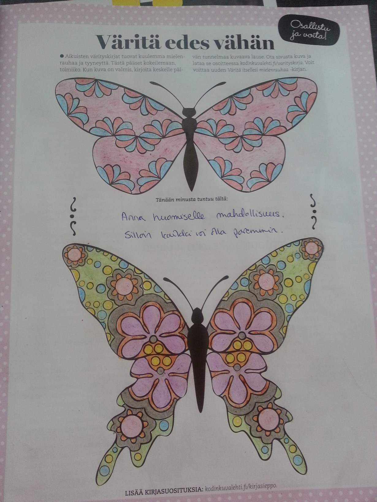 Mielenrauhaa aikuisten värityskirjasta - väritä perhoset ja voita! Anna huomiselle mahdollisuus. Kaikki voi olla silloin paremmin. 9.8.2015 klo 10:21