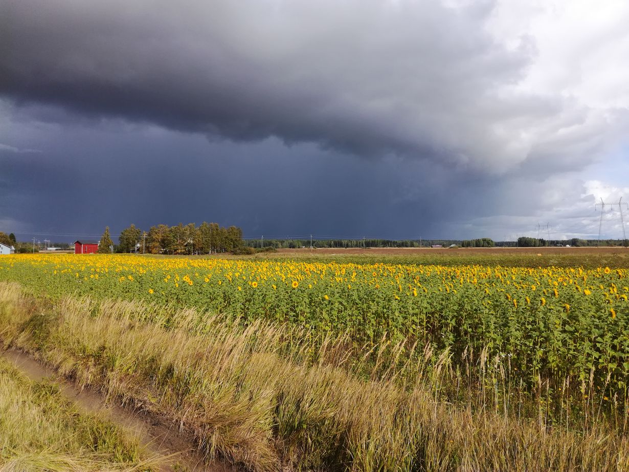 Auringonkukkapelto ja lähestyvä syyssade...Huikean näköinen sadealue lähestyy ja auringonkukat jymyilevät tietämättöminä.
