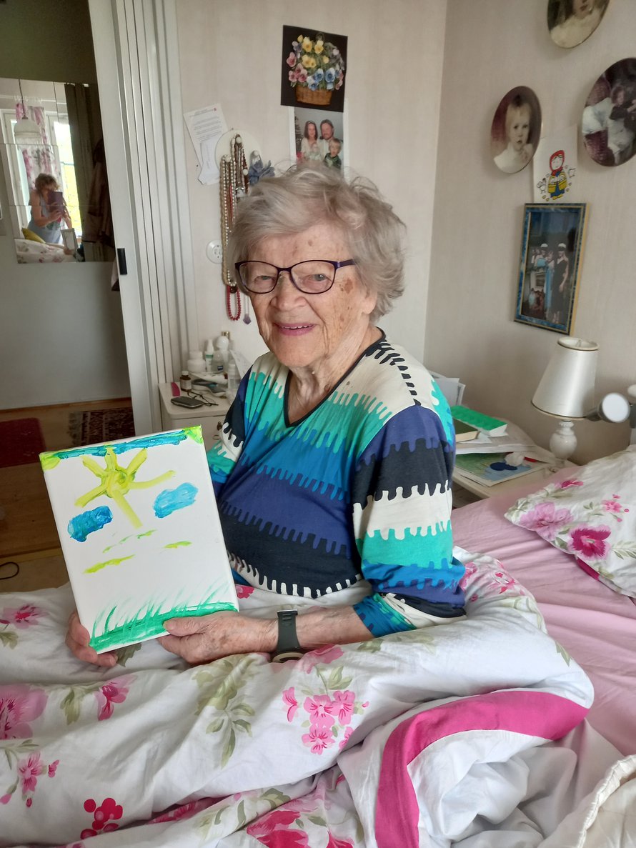 - Minun luonani paistaa aina aurinko, mummi iloitsee. Hän on saanut piirustuksen Helsingissä asuvalta lapsenlapseltaan. Maalaus on makuuhuoneen seinällä. Se säteilee valoa ja lämpöä.