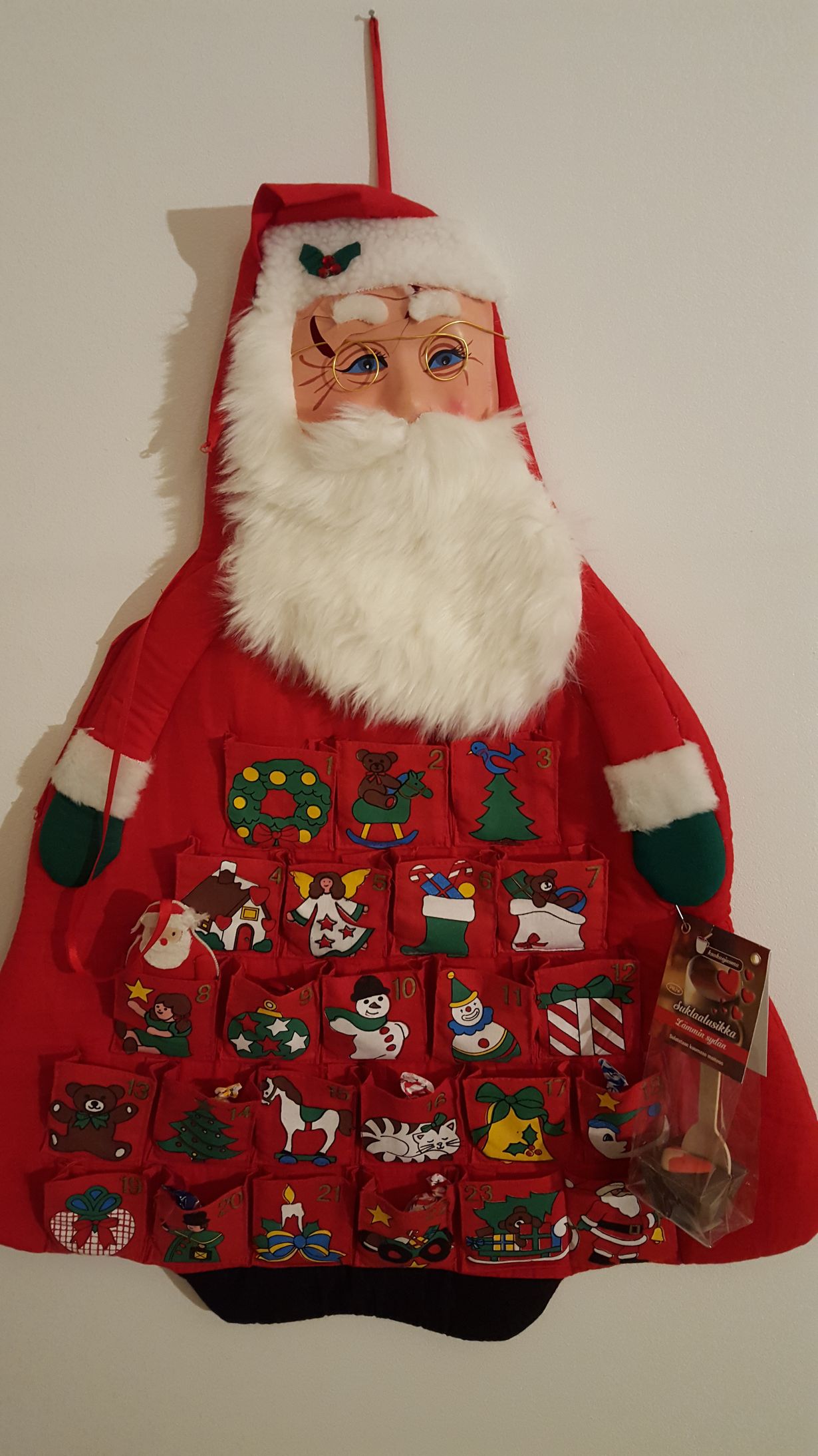 Tämä joulupukkikalenteri on reilut 10 vuotta sitten Gran Ganarialta. Kalenteri ostettiin vasta kävelyn oppineelle tytöllemme. Hän ei juuri suostunut istumaan vaan käveli ja kaatuili, mistä sai mustaksi silmäkulmankin. Kukka vaalella kutreilla tai antennipipo päässä kipittävä blondi sinisilmä ihastutti espanjaiset missä sitten vaelsikin. Kalenteri on otettu vuosittain esiin ja täytetty, paitsi joinain ekoina vuosina, kun tyttö sitäpiti vähän pelätä. Tänäkin jouluna joulupukkikalenteria käyttää edelleen niin ihastuttava sinisilmä, varhaisteini Sannimari 13v.