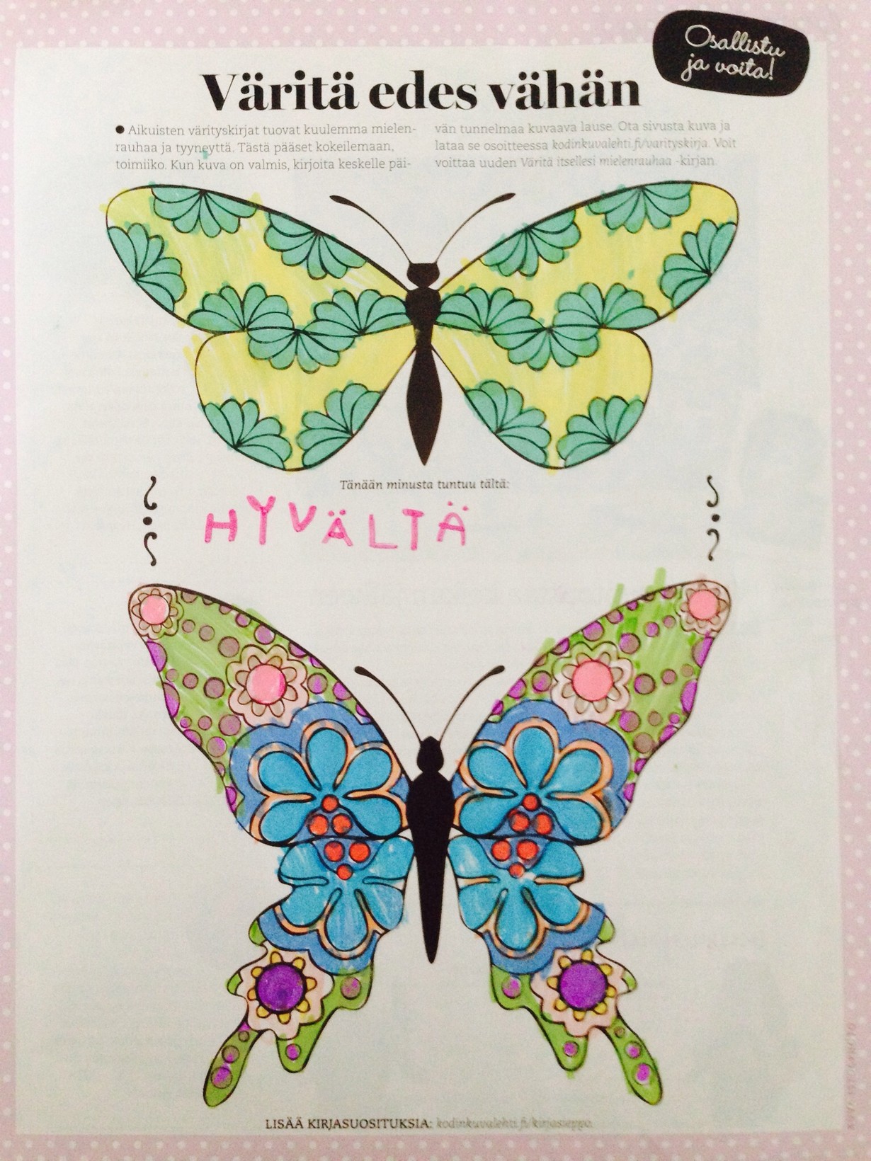 Mielenrauhaa aikuisten värityskirjasta - väritä perhoset ja voita!