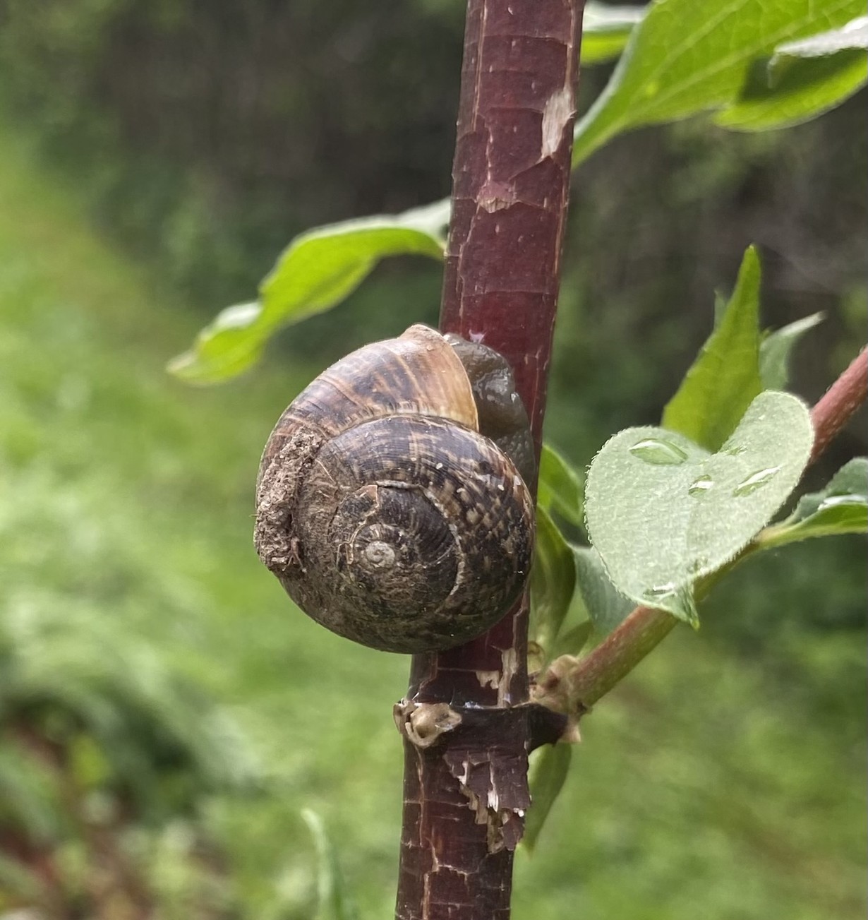 Vähän hämmästyin kun Loistojasmikkeen varressa oli tämmönen limanuljaska😳 on ihan tavis lehtokotilo, mutta heti nousi karvat pystyyn että nyt se syö mun kaunokaisen😅
