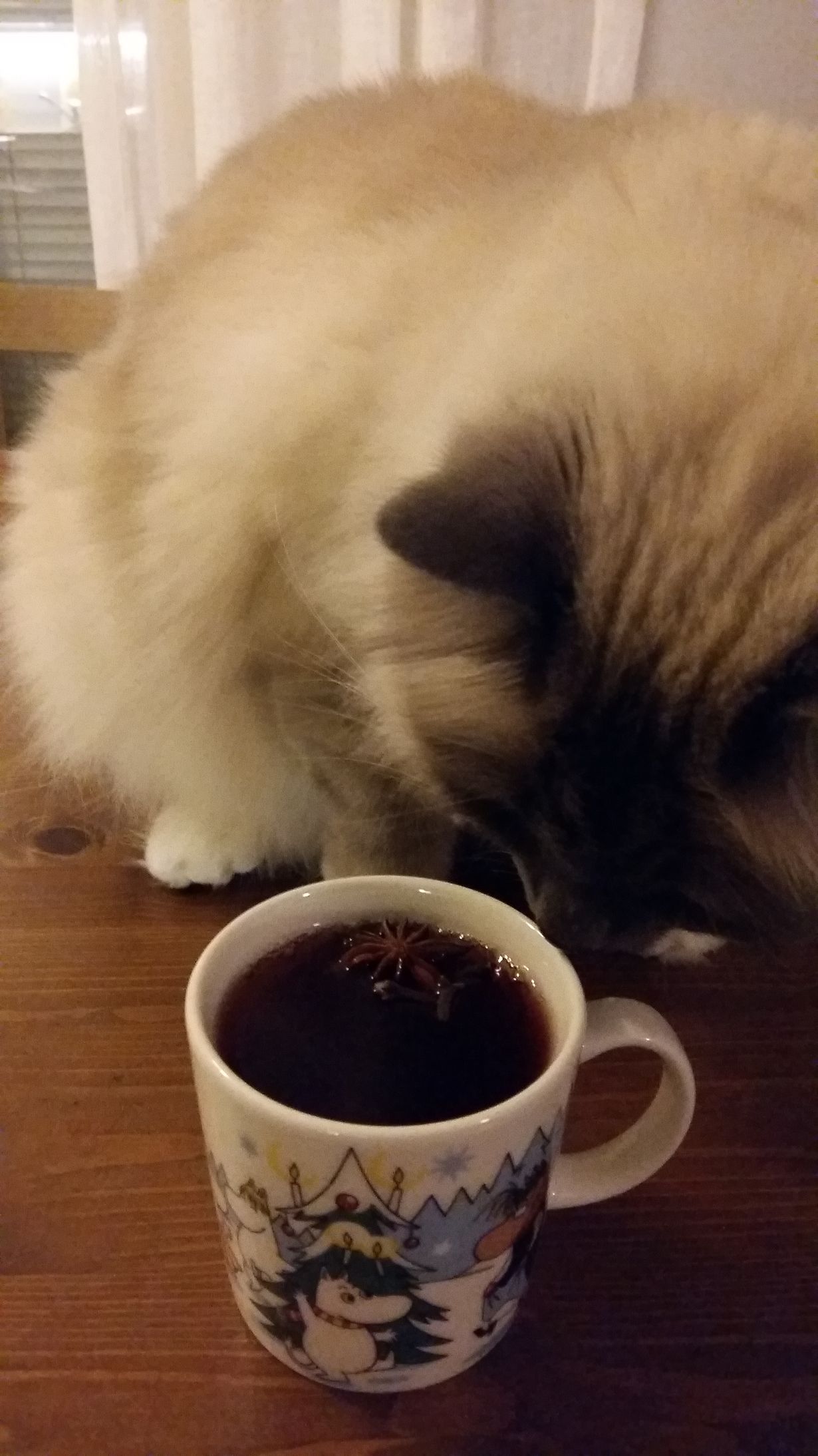 Glögiä muumimukista kissan kanssa