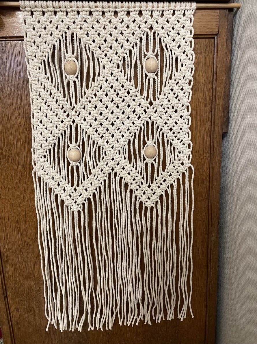 Moppilangan lopusta tein tämän makramee seinövaatteen, jonka annan tyttäreni perheelle.