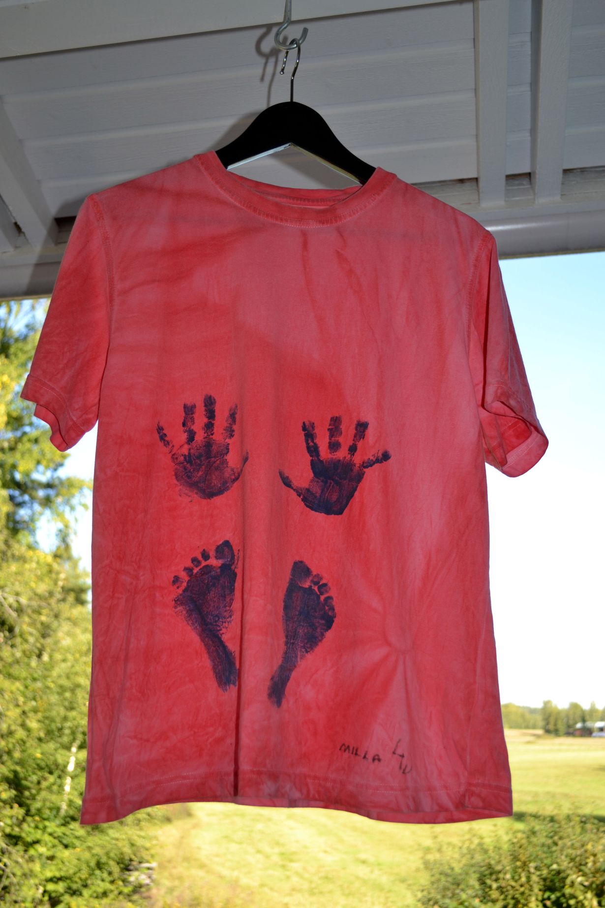 4-vuotias Milla antoi isälleen tuunaamansa t-paidan. Tyttö värjäsi aikuisen avulla valkoisen paidan pinkiksi ja jätti käden- ja jalanjälkensä paitaan muistoksi. Isä on ollut hyvin iloinen käytännöllisestä lahjasta.