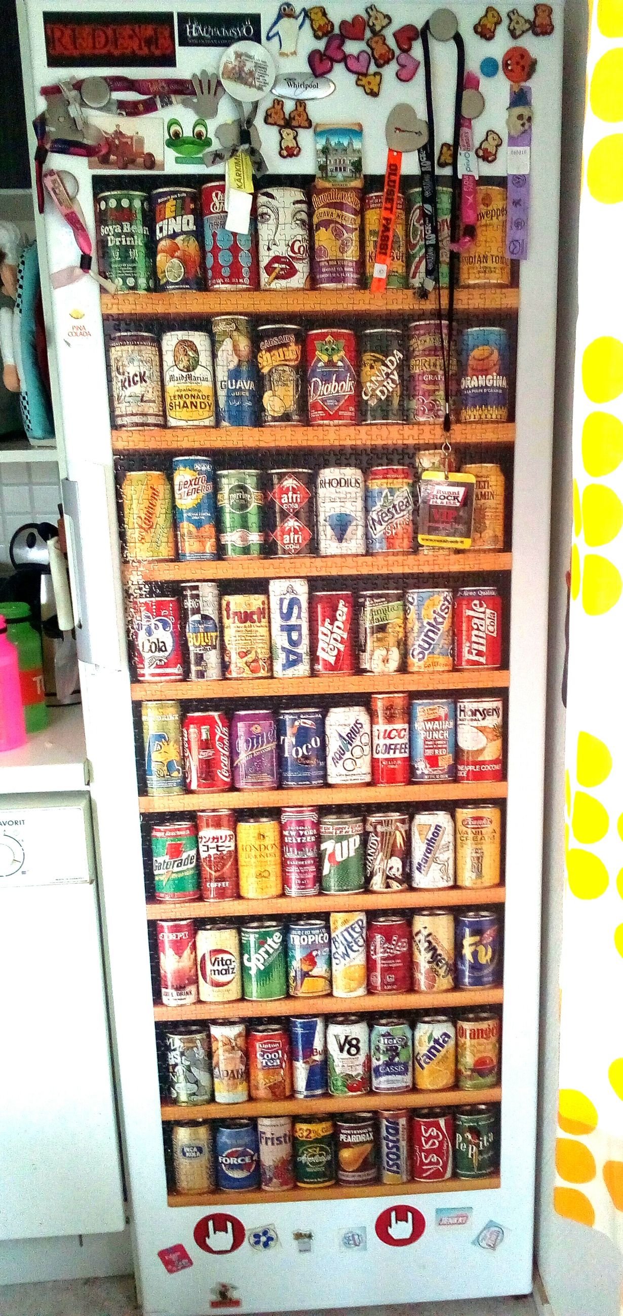 1500 palan palapeli peittää mukavasti jääkaapin valkoisen oven. Tarroja, magneetteja, festarirannekkeita yms tarttunut matkaan vuosien varrella ja minnekkäpä muualle ne laittaisi kuin jääkaapin oveen.