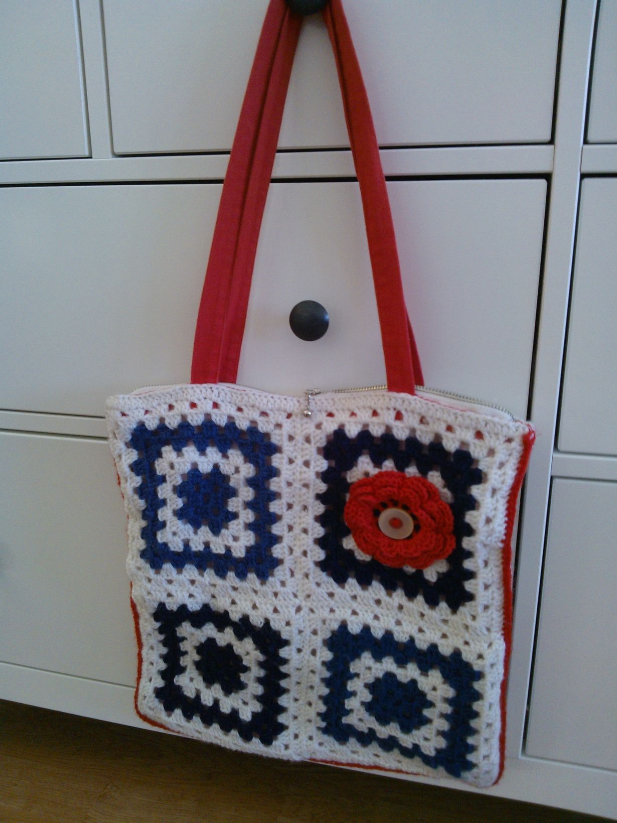 Virkkasin vanhan hangaskassin päälle isoäidinneliöitä ja ompelin vetoketjun suuaukkoon. Vielä virkattu kukkanen mansikaksi kakun päälle :)