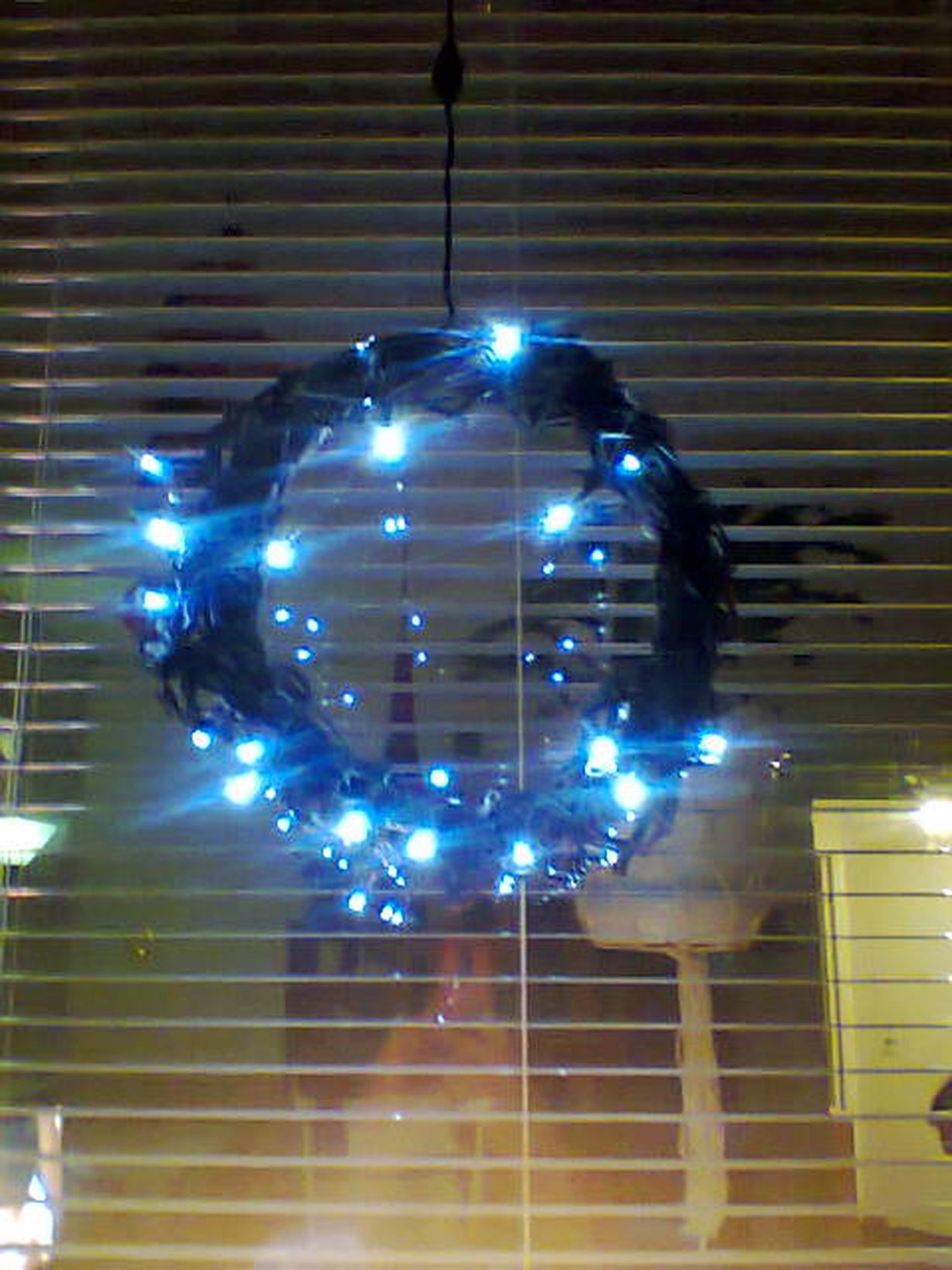 Jouluhaaste 6: Lähetä kuva jouluvaloistasi Itse tehty kranssi 18.12.2015 klo 21:33 Ulkona ikkunassa on itse tehty kranssi,valot näyttävät sinisiltä,vaikka on itse asiassa kirkkaat valot.