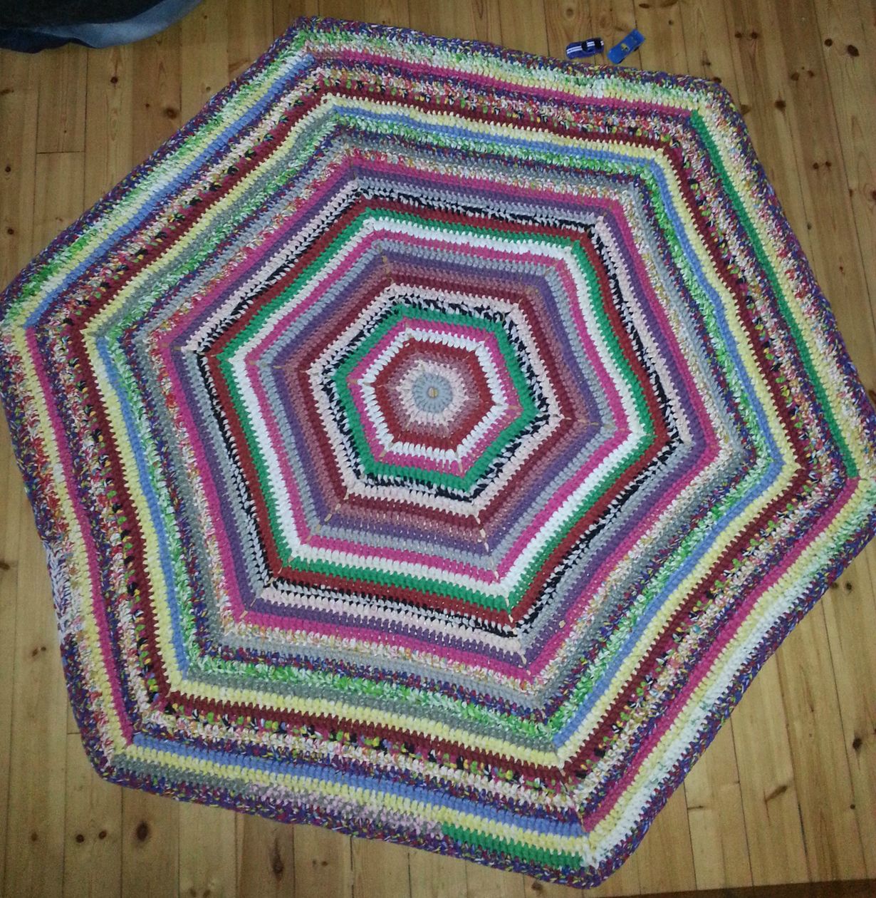 Mattojen virkkauksesta ylijääneistä kuteista valmistettu hexagon-matto. ohje 4/2014 suuri käsityö. Tämä työ menee lahjaksi lastenhuoneeseen.