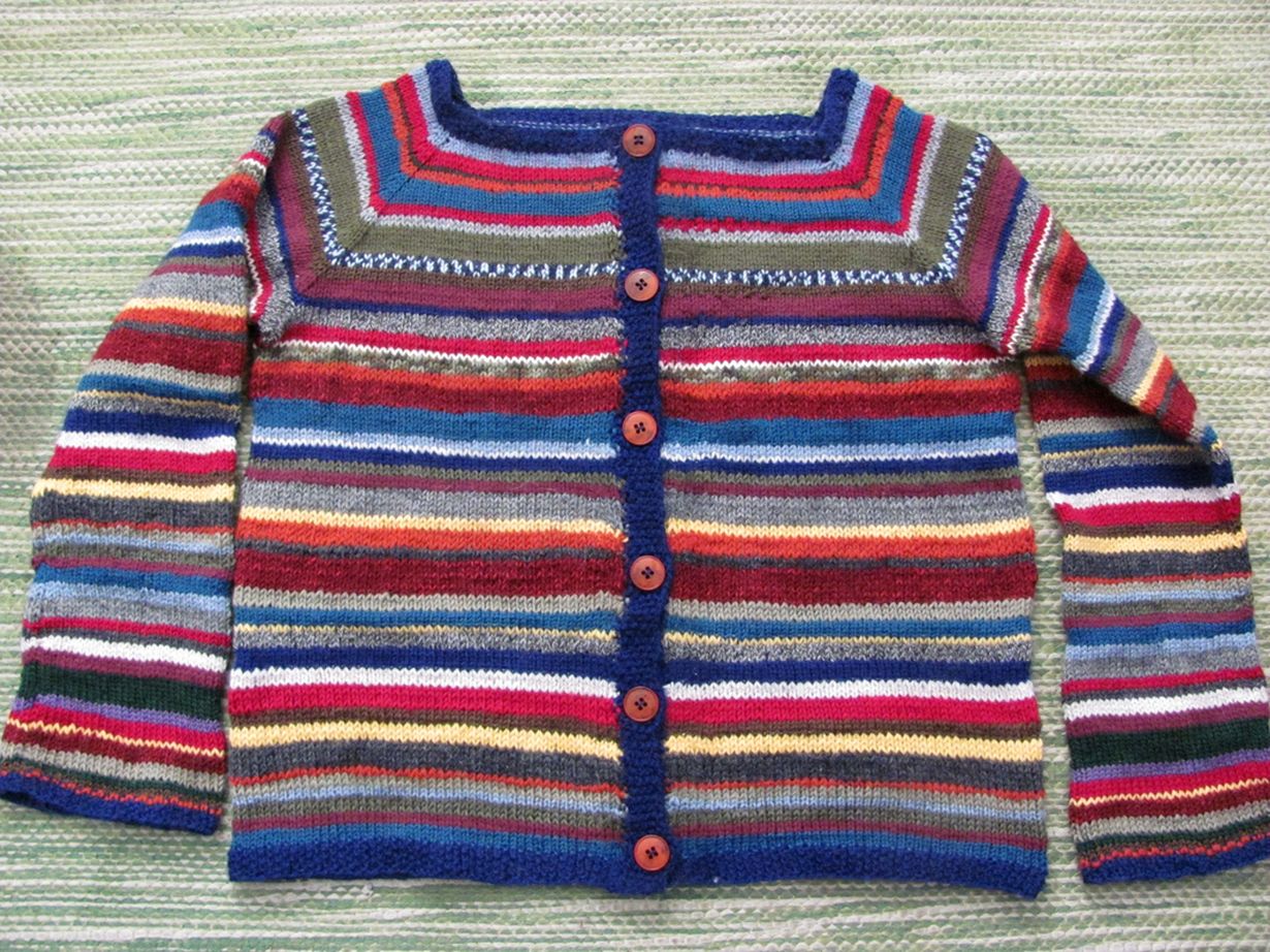 Ensimmäinen kokeiluni neuloa takki ylhäältä alaspäin. Koska lankojen riittävyyttä piti jännittää, neuloin aina muutaman raidan hihoja ja sitten keskiosaa. Kuten usein ensimmäisen yrityksen kanssa käy, jotain menee vähän pieleen. Tästä takista tuli turhan leveä, mutta ei se onneksi menoa haittaa. Takki on tehty naiselle.