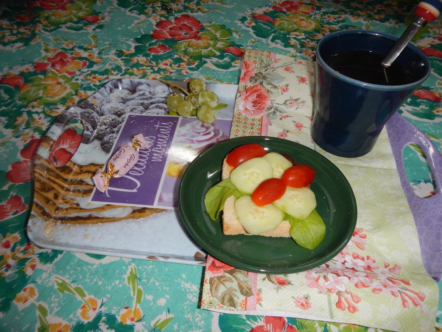 Iso suodatinkahvi ja 1 - 2 leipäviipaletta. Ohut juustoviipale, kurkkua, tomaattia ja oman maan salaatinlehtiä. Lisäkkeenä mansikoita, vadelmia, pensasmustikkaa - paremman puutteessa viinirypäleitä. Joskus keitetty muna. Puurot eikä jogurtit eivät maistu.