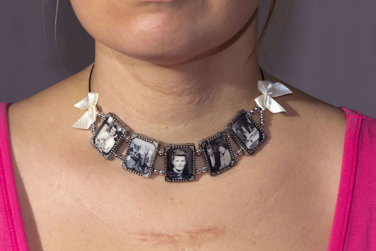 Skannatessani isoäitini vanhoja kuvia syntyi idea kuviin pohjautuvasta korusta. Tulostin ja liimasin ne pienennettynä koruaihioihin ja laitoin väliin hopeahelmiä. Tämä koru on kunnianosoitus sitkeälle naiselle, joka sairastui polioon vain 17-vuotiaana, mutta on elänyt, tehty työtä ja kasvattanut lapsia yhdellä toimivalla jalalla samaan tahtiin kuin muut kahdella.