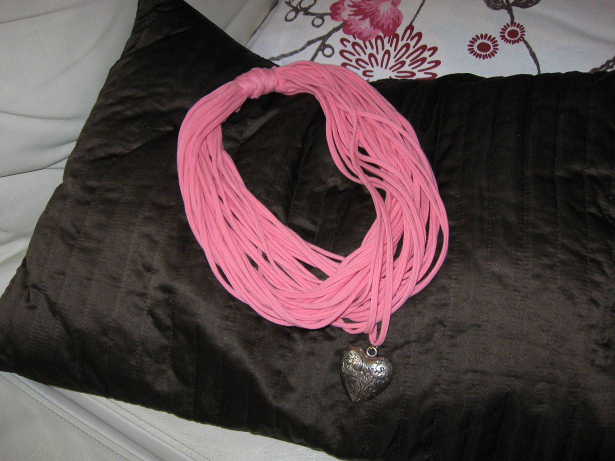 Suuri Käsityö - itse tehty koru kaulakoru 4.1.2013 klo 15:18 Käytetystä t-paidasta leikattuja renkaita yhteen pujotettu metallisydän sauma kohta nyöritetty, näin näyttävä koru valmis. maggi- mummo