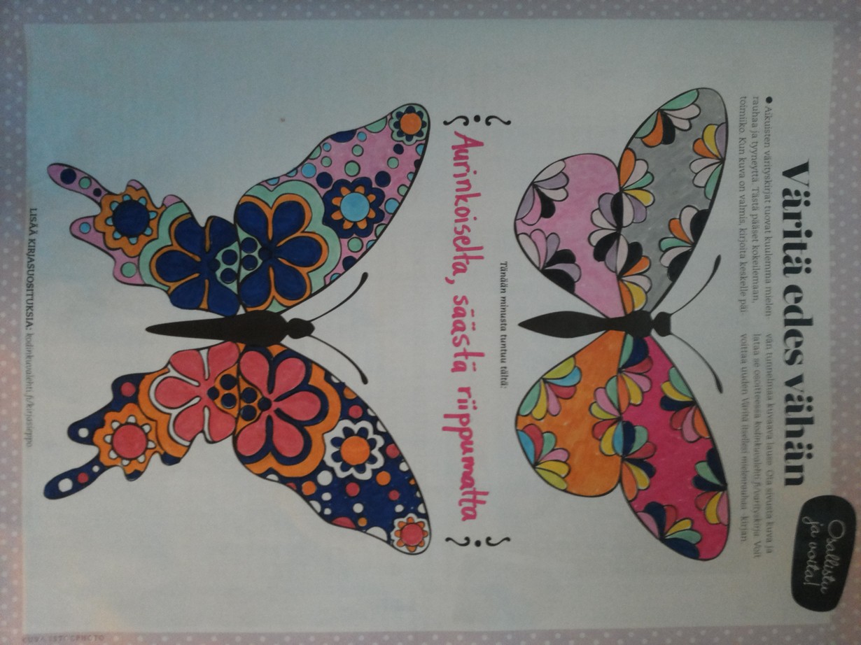Mielenrauhaa aikuisten värityskirjasta - väritä perhoset ja voita! Kesäfiilisperhoset 30.7.2015 klo 19:52 Tänään minusta tuntuu aurinkoiselta, säästä huolimatta.