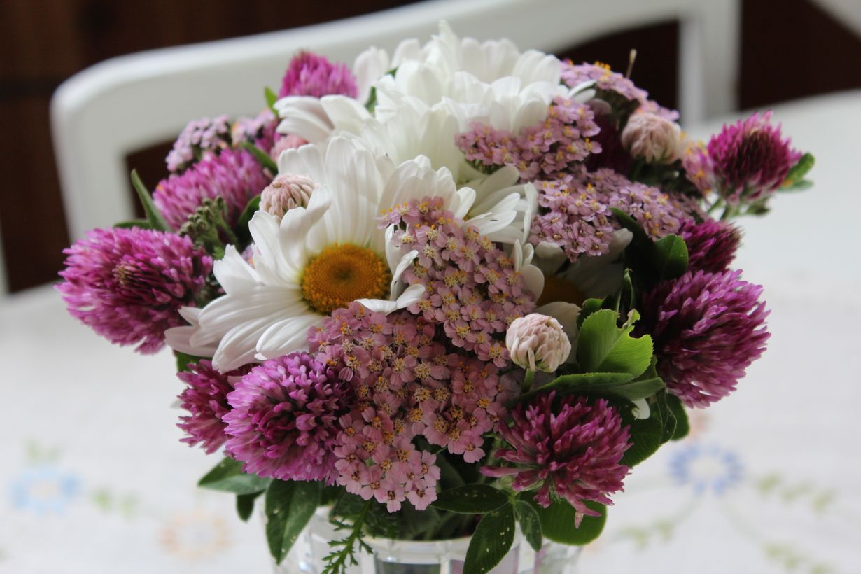 Apila, päivänkakkara ja pinkki siankärsämö. Nimistä en ole varma, mutta em nimillä ne tunnen. Kesäaamuisin koiralenkillä kerään myös kukkakimpun sulostuttamaan ihanaa vanhaa kesäkuistiamme.