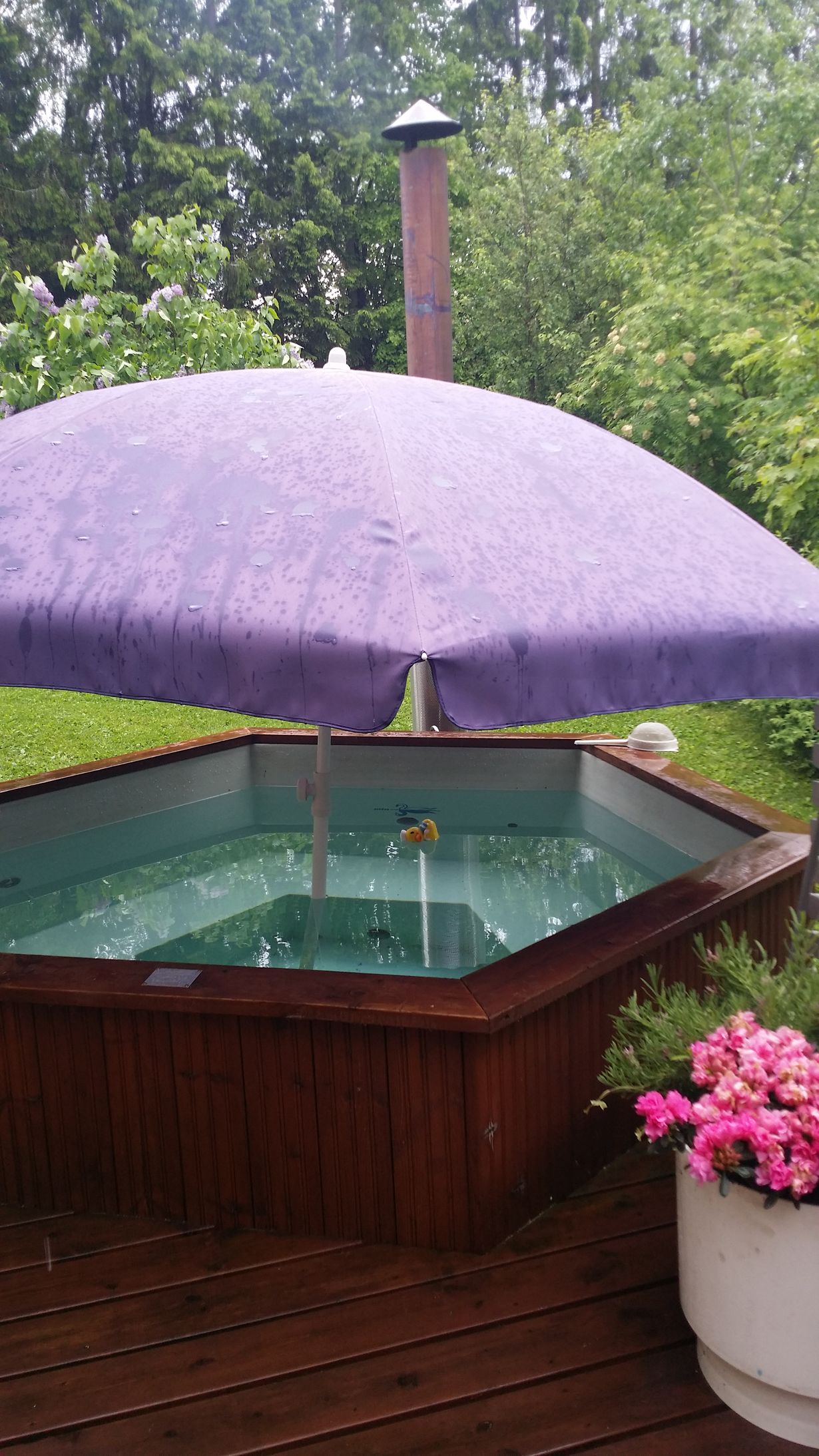 Paljun juhannusilme. Sataa sataa ropisee... lämmin paljuvesi, mutta kylmä sade ropisi päähän. Aurinkovarjolla ei ollut juuri tehtävää tänä juhannuksena, niin sai uuden tehtävän sateenvarjona. Ja meillä kakkilla oli niin mukavaa.