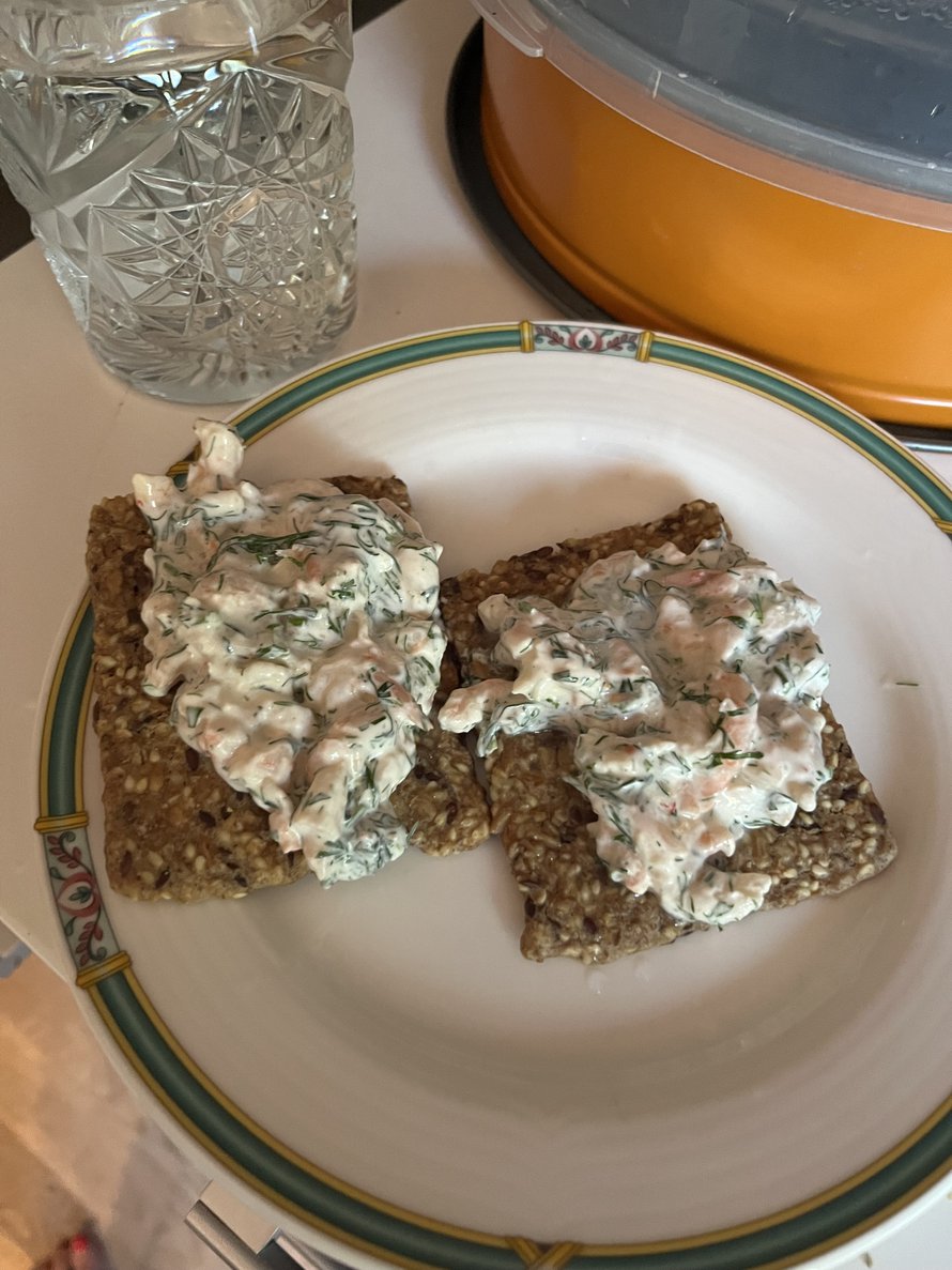 Skagenröra eli itse kuorittuja katkarapuja, kermaviiliä, tilliä, sipulia, vähän Dijon-sinappia ja tilkka konjakkia.