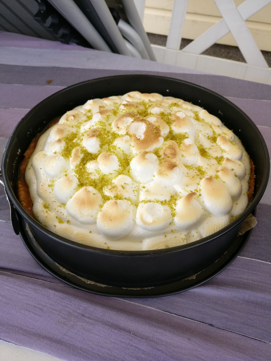 Muistelin leivontainnostuksessani yläasteen köksäntunnilla tehtyä sitruunamarenkipiirasta, mutta sekoitin sen keylime-piirakkaan. Lähdin sitten Key lime -piirakan ohjeesta soveltamaan itselleni torttua. Tein murupohjan päälle sitruunakiisselin, jonka piti hyytyä. Sitten siihen päälle kauniisti kullattua ranskalaista marenkia raastettua limen kuorta. No... sitruunakiisseli ei koskaan hyytynyt ja matkalla mummolaan marenkihuntu keinui kiisselin päällä kuin aallokossa. Kakun maku oli erinomainen, mutta mahdoton syödä koostumuksensa vuoksi. :D
