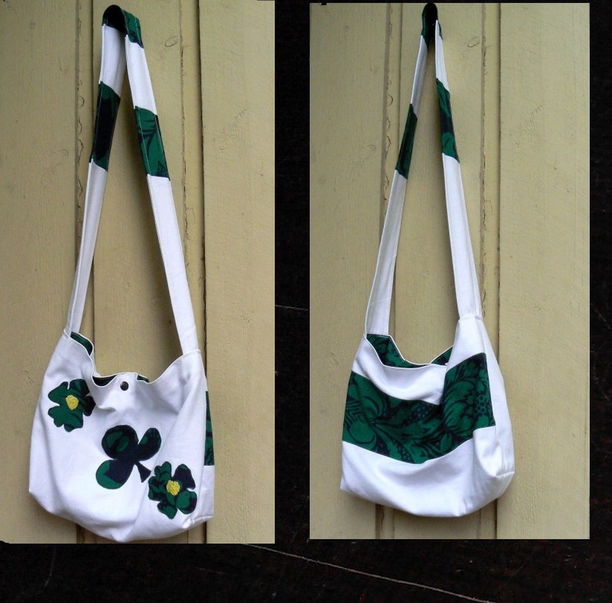 Tämän kassin ompelin itselleni kierrätyskankaista. Kuva on edestä ja takaa sama kassi. Kassissa on Vuori aplikointina käyttämästä kankaasta, kännykkä tasku ja sivutasku. Kassi on melko avonainen, suljetaan päältä vain yhdellä isolla nepparilla ja koska hihna on leveä ja puuvillaa, niin se pysyy hyvin olalla. Kätevä kesäkassi ja on ollut kovassa käytössä koko viimekesän ja varmasti vielä tulevatkin kesät. :) .