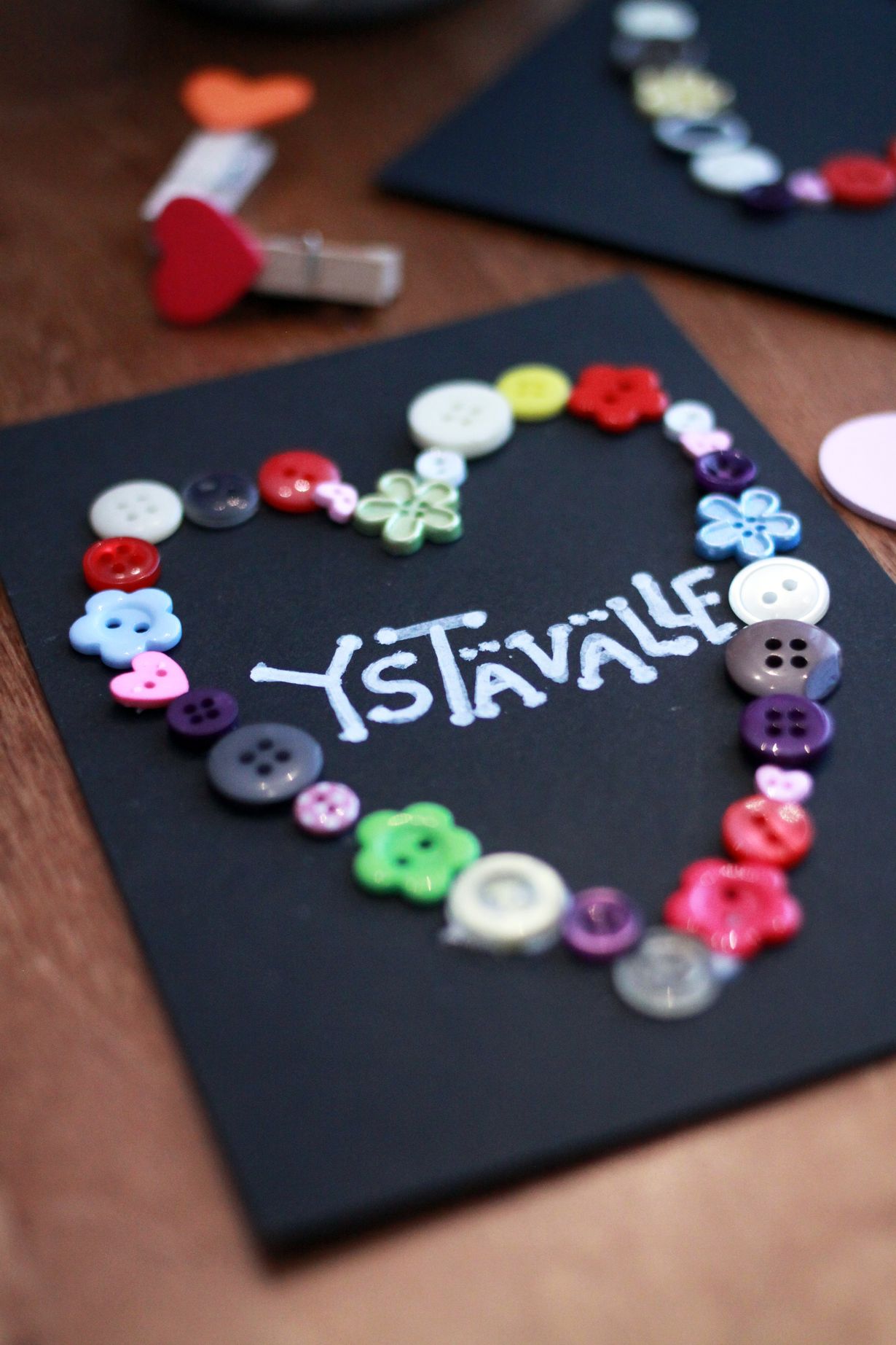 Suuri Käsityö - itse tehty ystävänpäiväkortti Kortti ystävälle 10.2.2015 klo 16:06 Pikku neitien kanssa tehtiin napeista kortteja ystäville ja lähetettiin ne postitse. Ideatasku