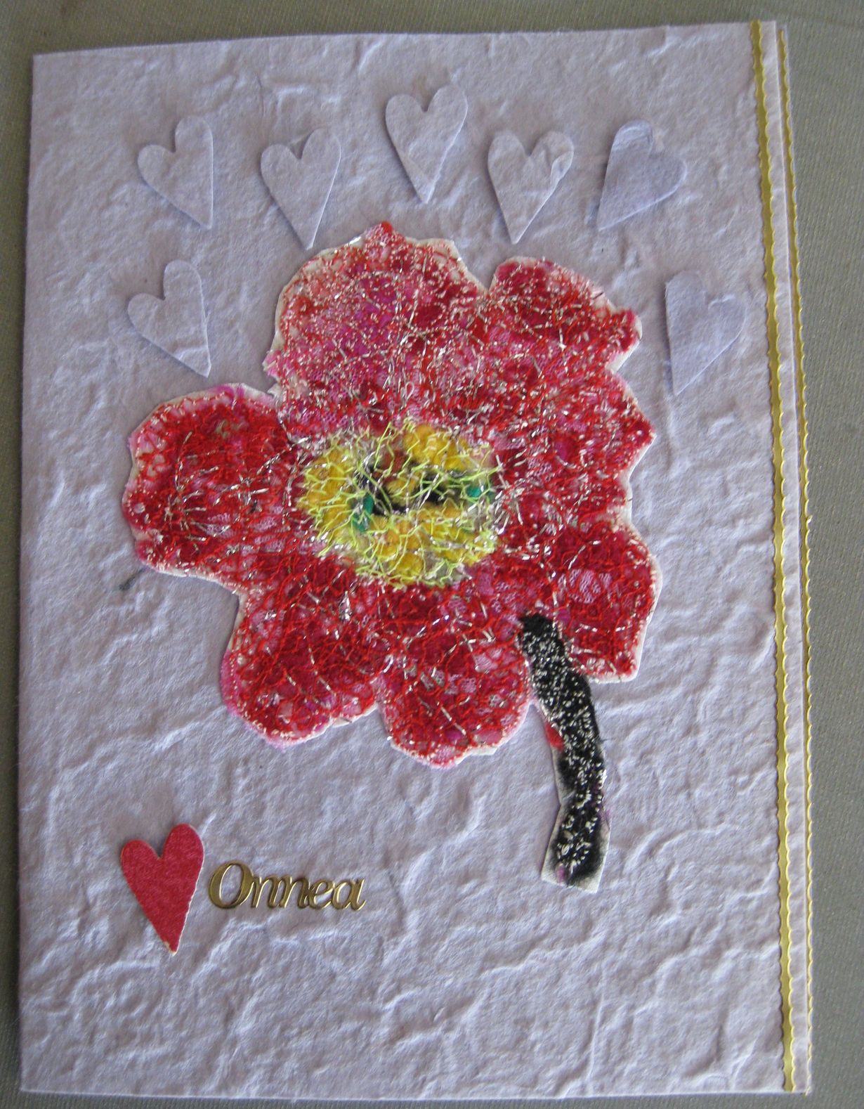 Suuri Käsityö - Jämälankakäsitöitä Kukka jämälangoista 13.5.2014 klo 11:15 Kankaalle kerätty langanpätkiä ja konekirjonnalla ommeltu kiinni. Maij-lis
