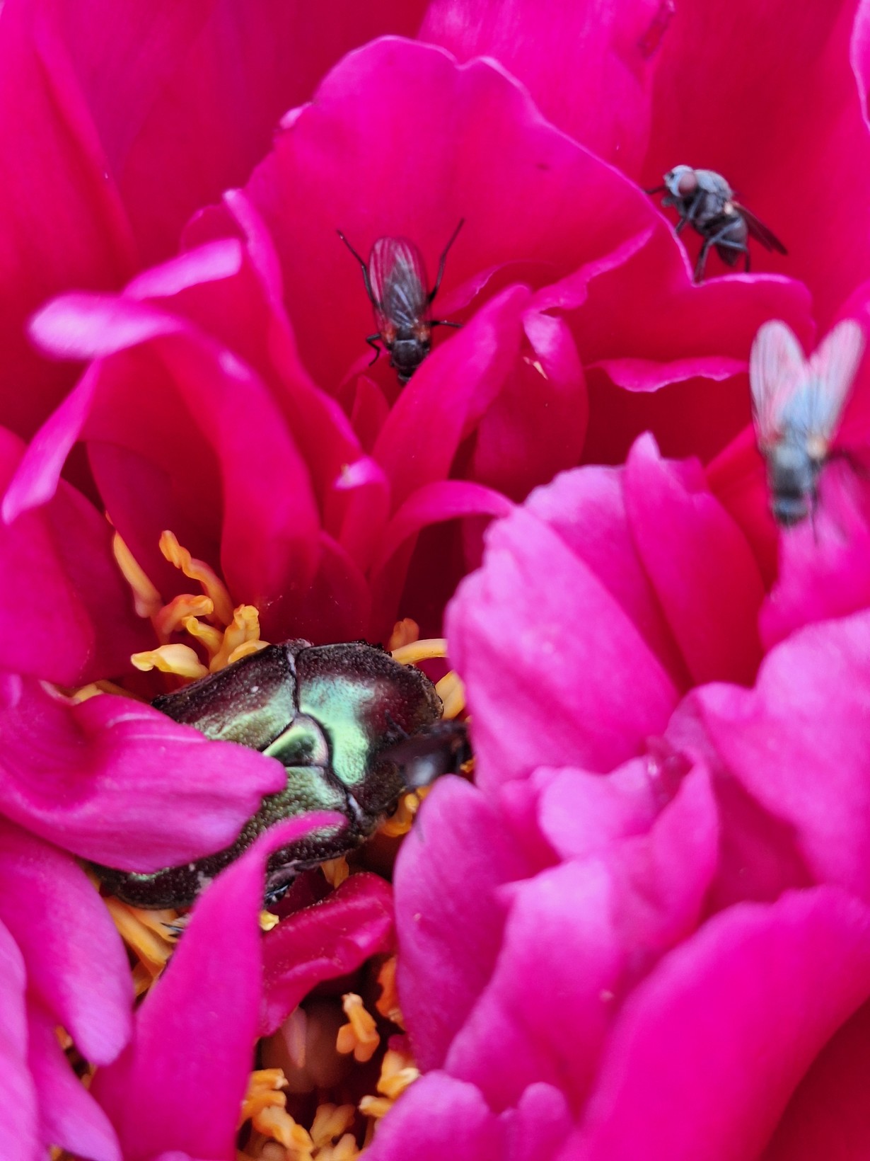 Kultakuoriainen prinssinä meden äärellä. Kärpäset hovineitoina ympärillä.