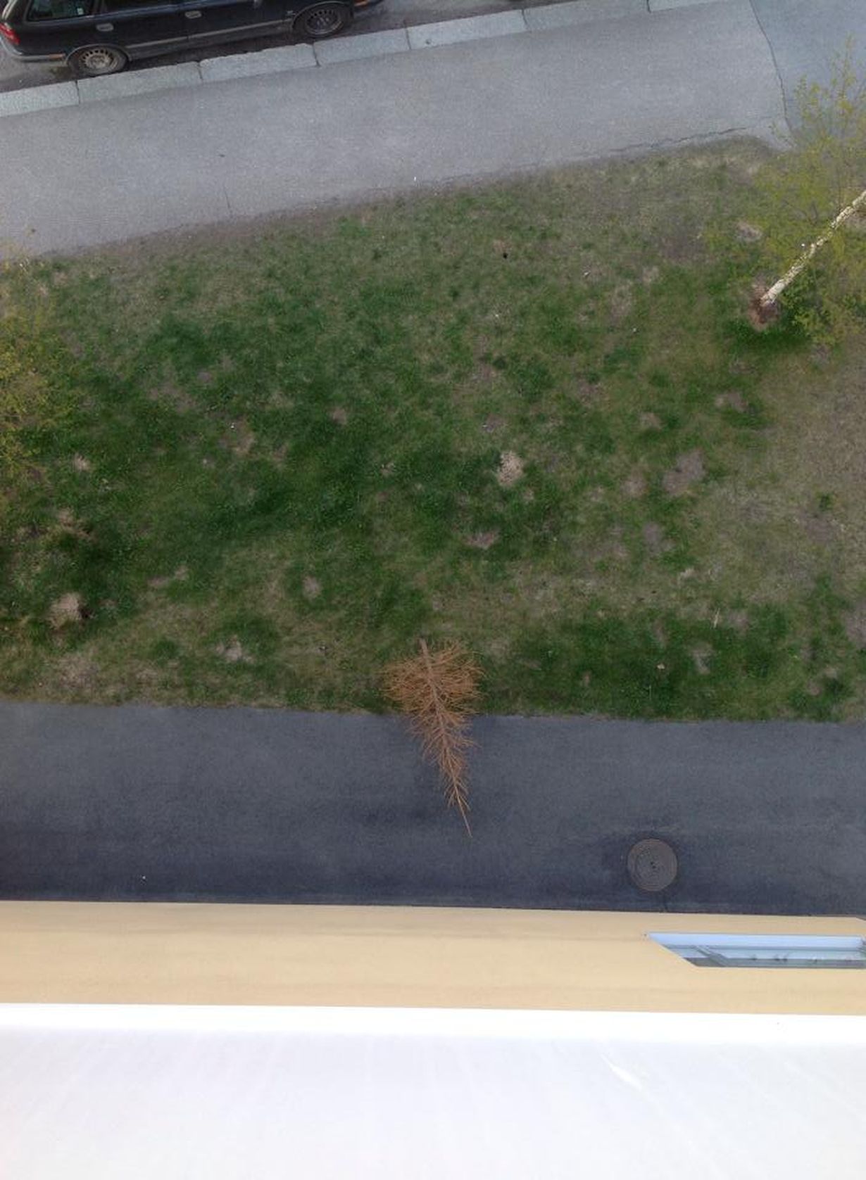 Toissa jouluna ostin ensimmäisen ikioman kuusen. Joulu oli lumeton ja vetinen, tammikuun alussa tuli lumi. Kuusi oli silloin vasta kauneimmillaan, en todellakaan halunnut luopua siitä! Tuli kevät, pääsiäinen, lämpimät säät, kuusi pysyi parvekkeella. Mietin miten saan sen alas 4. kerroksesta sotkematta joka paikkaa kuiviin neulasiin. Ja mitä naapurit ajattelevat kuivuneesta kuusesta roskiksilla, ottaako roskakuski sitä edes kyytiin... Toukokuun 6. päivä, aamulla viiden aikaan heitin kuusen parvekkeelta alas. Se jätti maahan enää pienen kasan neulasia, suurin osa oli jo varissut parvekkeelleni. Juoksin alas ja kiikutin karahkan roskiksille. Oli se sieltä hävinnyt, kun seuraavan kerran menin viemään roskia. Kuusestani oli jo tullut todellinen vitsin aihe kaveriporukassamme.