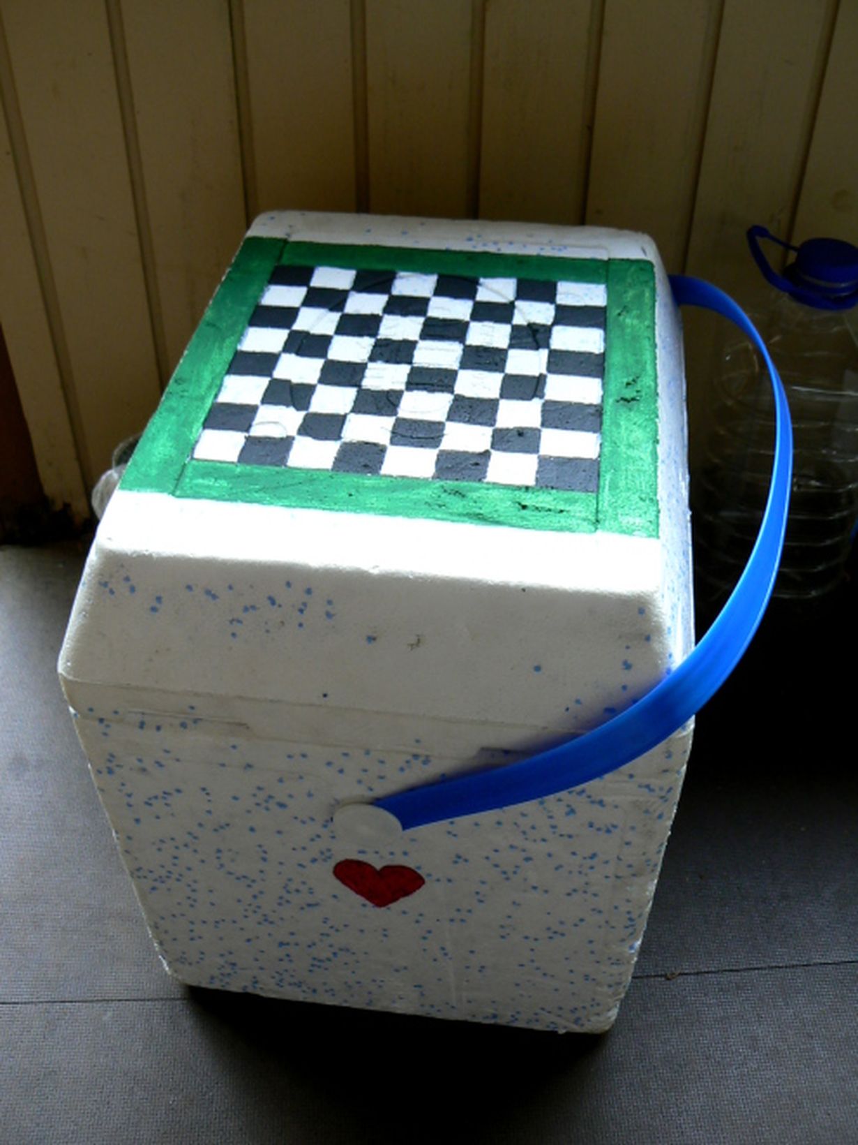 Ei ihan kassi, eikä pussukka, mutta laukku tämäkin. Ei tule tylsää rannalla, eikä sekoitu toisten kylmäkasseihin, kun on maalattu pelilauta kannessa.