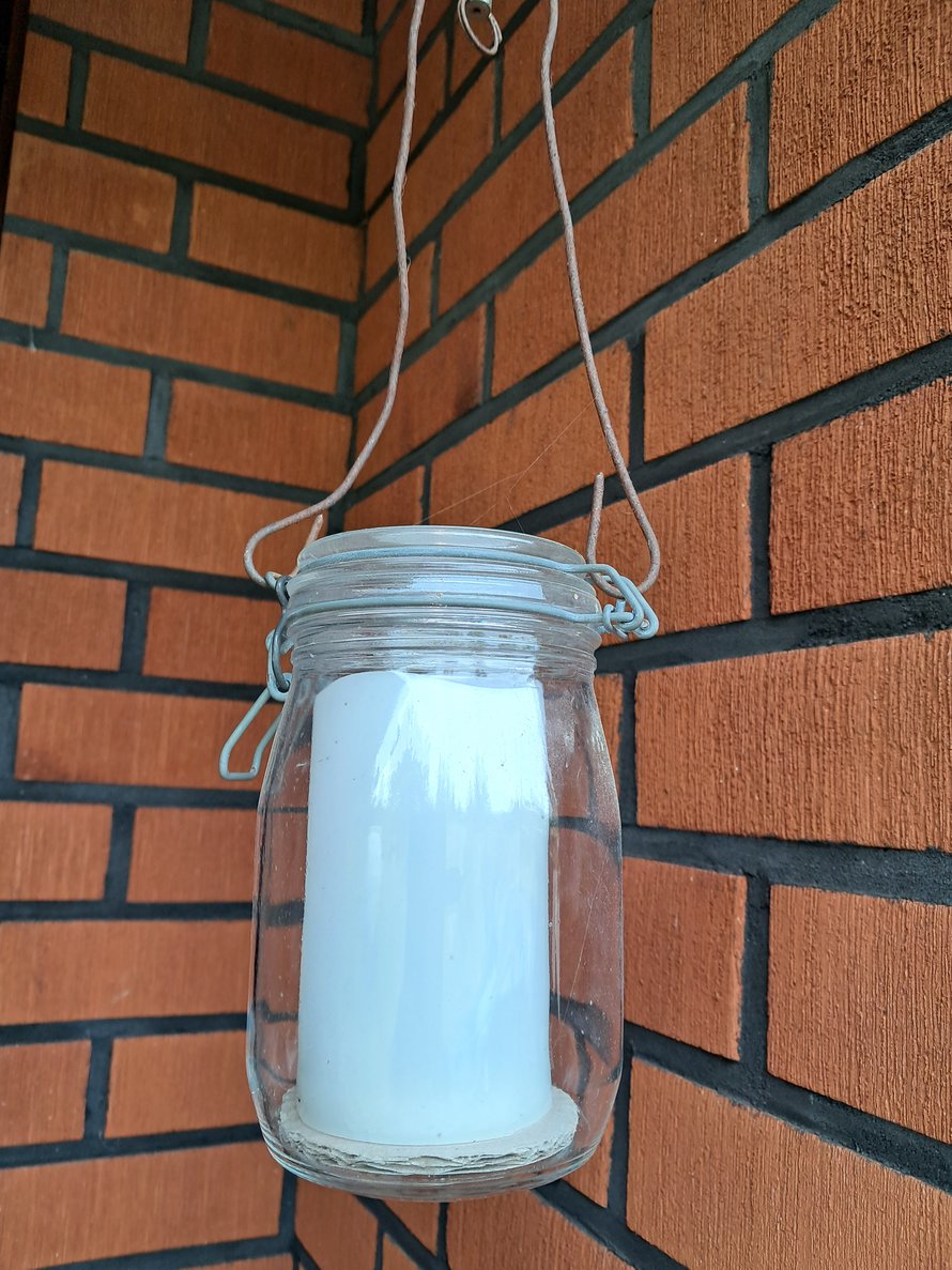 Lasinen säilykepurkki palvelee rappusyvennyksessä lyhtynä. Siinä on patterkynttilä turvallisuuden vuoksi.