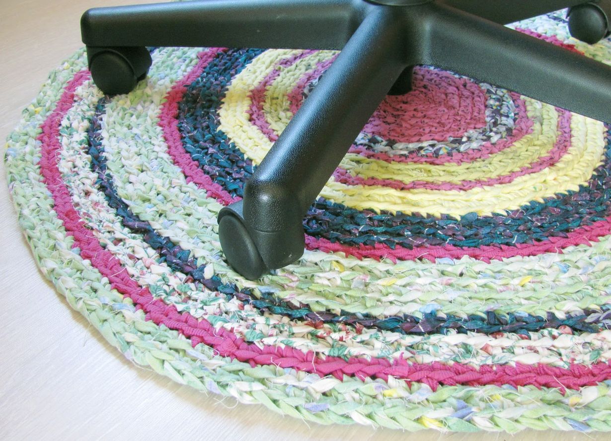 Halusin tietokonetuolin alle pyöreän, huoneen kirkkaisiin sävyihin sopivan maton. Käytin mattoon useita kuteiksi leikattuja vaatteita, sekaisin puuvillakangasta ja T-paitoja. Lisänä yksi pussilakana.
