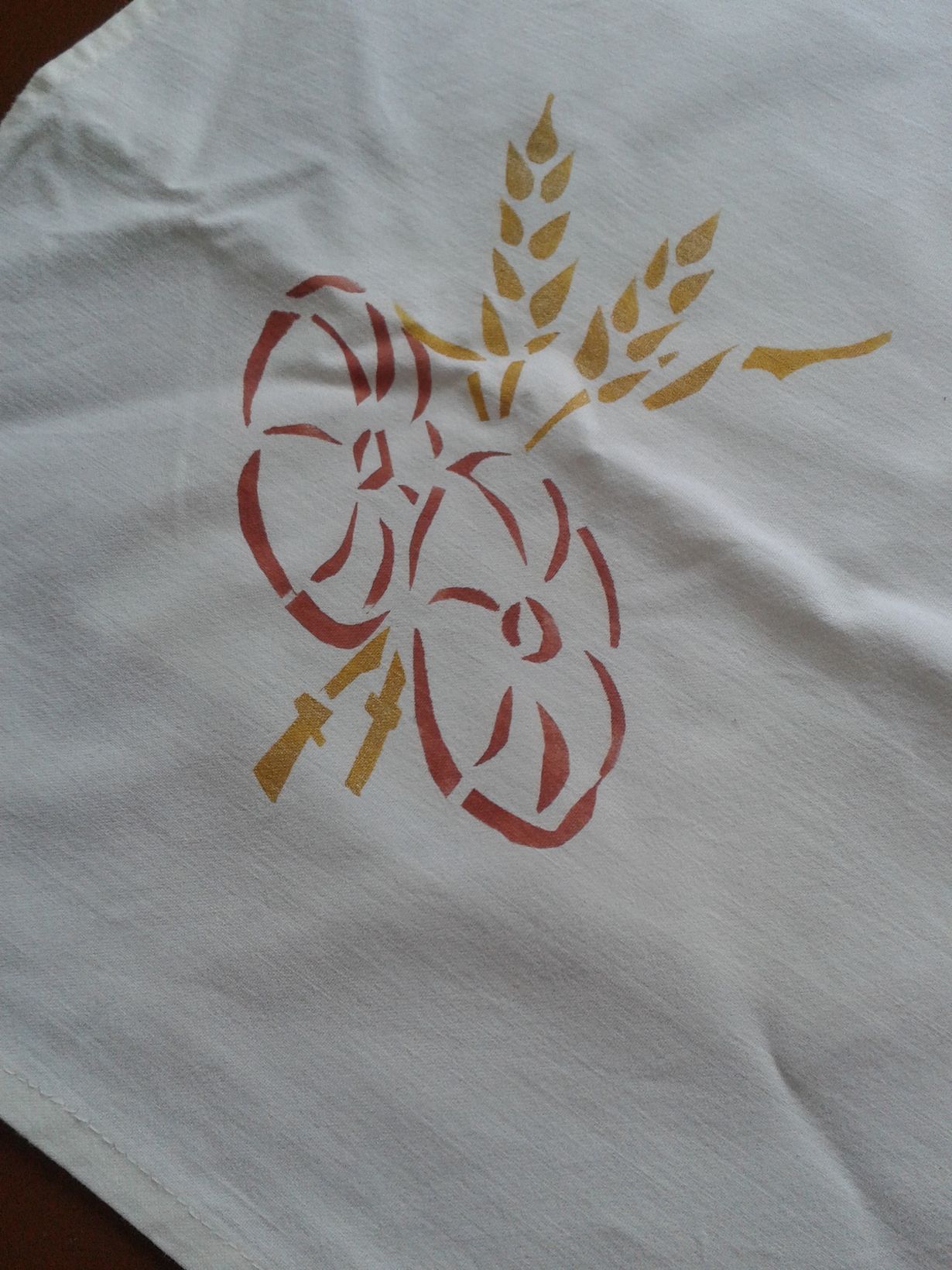 Vuonna 2000 edesmenneen äitini käsin painama leivinliina. Liinan kaikissa kulmissa on kuva kahdesta leivästä ja tähkistä. Käytän tätä edelleenkin kohottaessani sämpylöitä tai leipää.