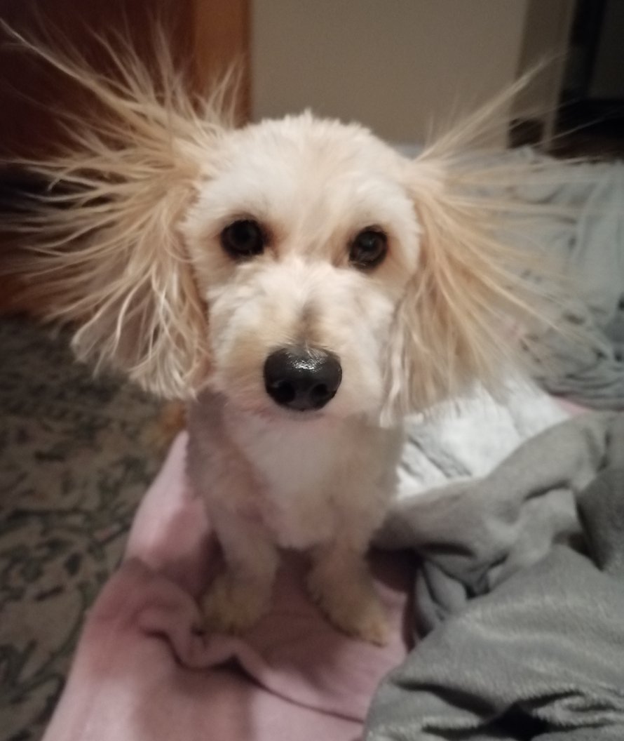 Kuvassa 5 v Helmi koirani. Sekoitus mäyräkoiraa/bichon friseetä. Viisas tietenkin ja frisyyri kuin emännällä☺️