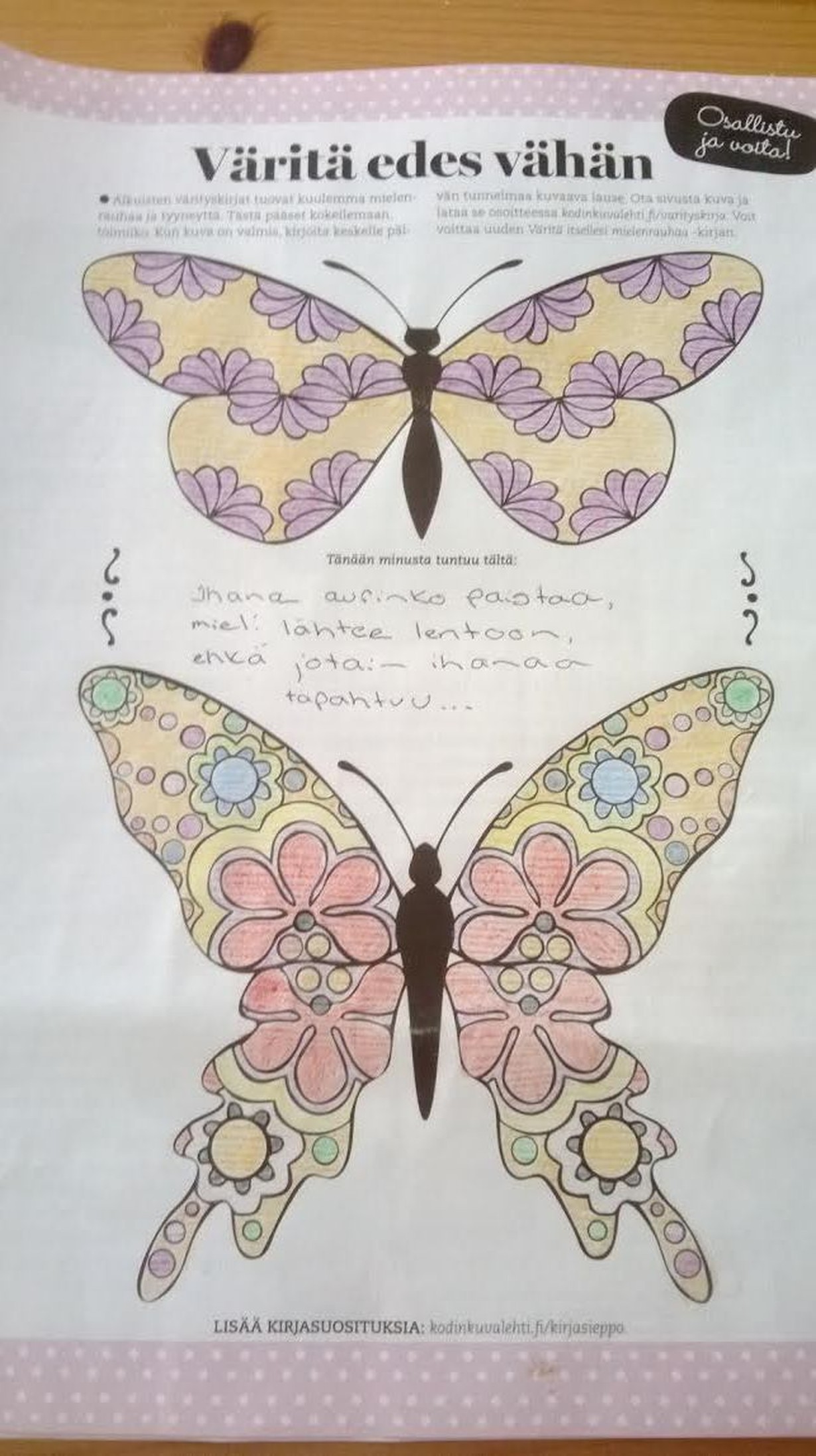 Mielenrauhaa aikuisten värityskirjasta - väritä perhoset ja voita!