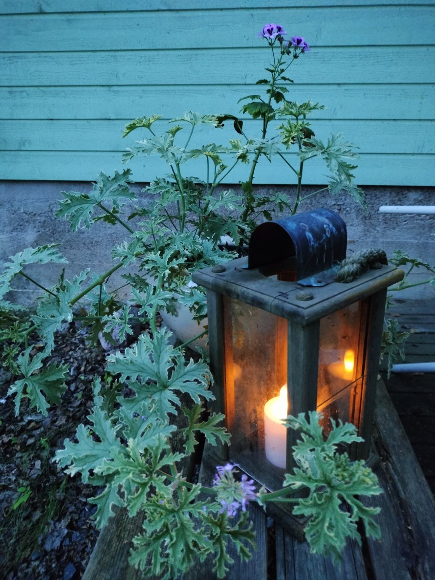 Pihasaunan edessä penkillä komeasti kasvanut tuoksupelargonia pyysi valoa vierelleen sateisena elokuun sauna päivänä. Lyhty löytyi saunan pukuhuoneen kaapista jossa se kuuliaisesti oli kesän odottanut tätä hetkeä.