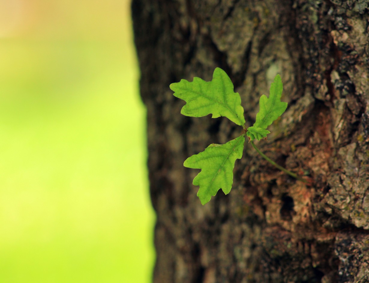 Kuva sopisi huhtikuulle. Kuvattu keväällä Sastamalassa Salmin kylässä. Kuvassa vanha tammi jonka kyljestä sitkeästi versoo uusi oksa.